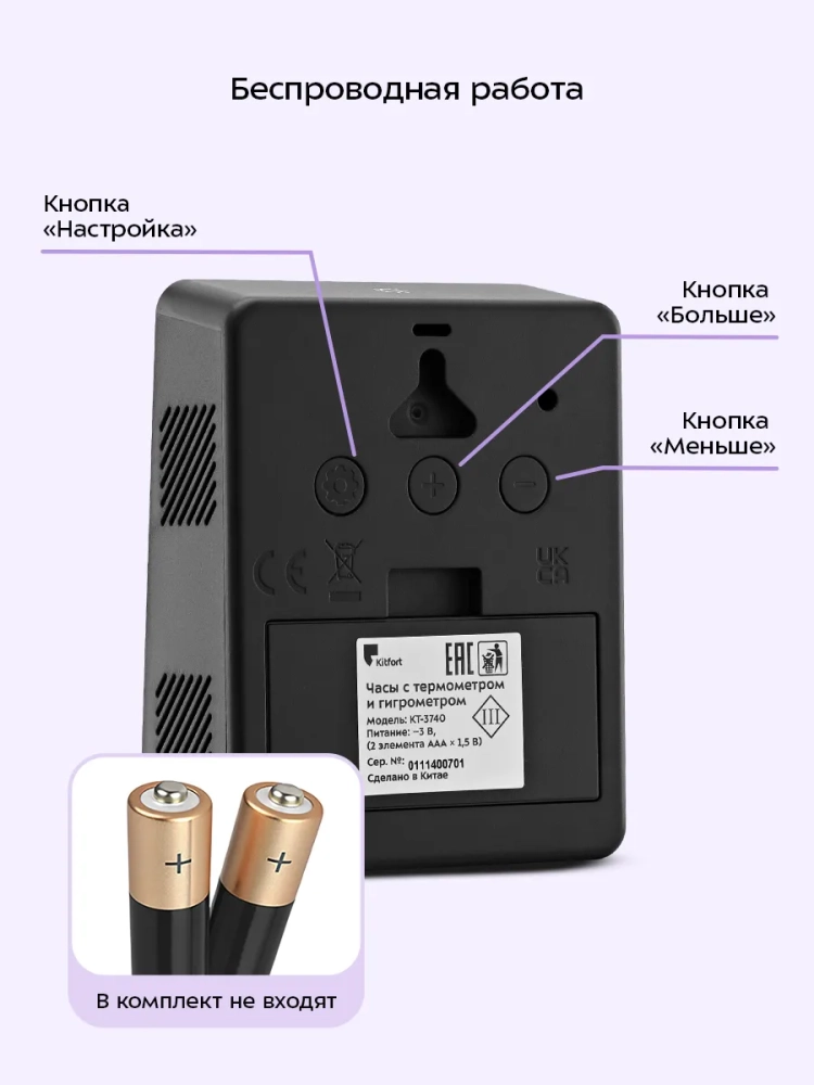 Часы работают от 2 батареек типа ААА (не входят в комплект), благодаря чему их можно расположить в любом удобном для вас месте. Прибор можно повесить на стену или поставить на стол. На задней части устройства расположено отверстие для настенного крепления.