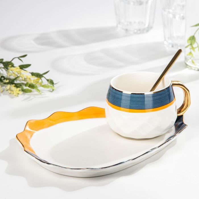 Чайная пара керамическая с ложкой «Аврора», 2 предмета: чашка 250 мл, тарелка 21×17×2 см