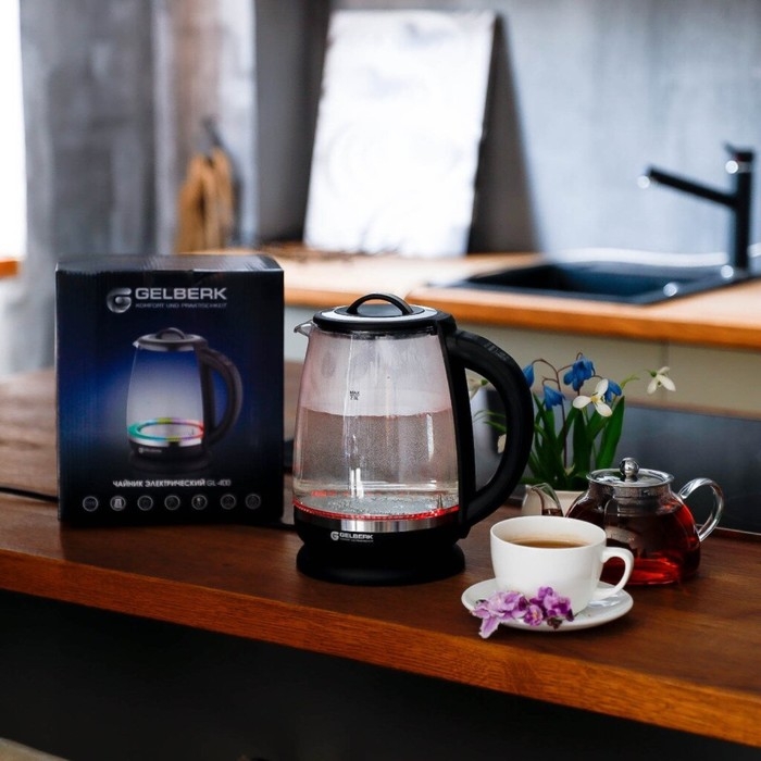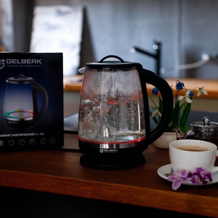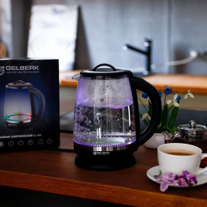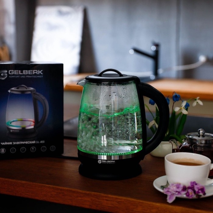 Чайник электрический Gelberk GL-400, стекло, 2 л, 2200 Вт, чёрный