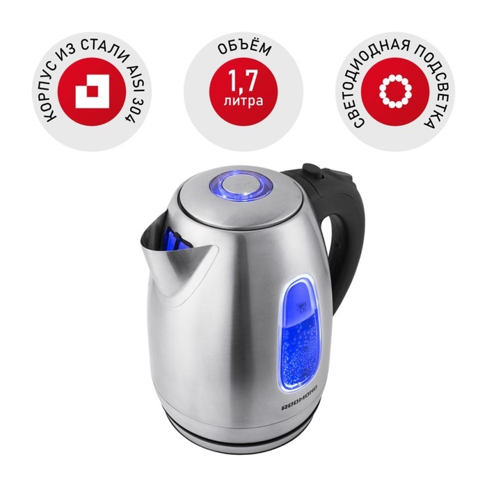 Чайник электрический Redmond RK-M183, металл, 1.7 л, 2200 Вт, подсветка, серебристый
