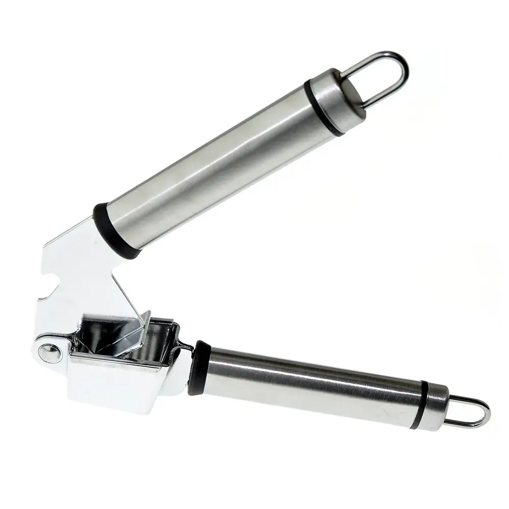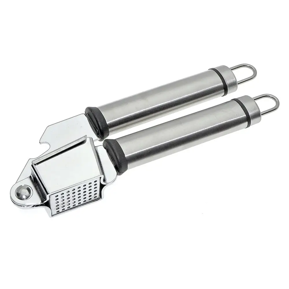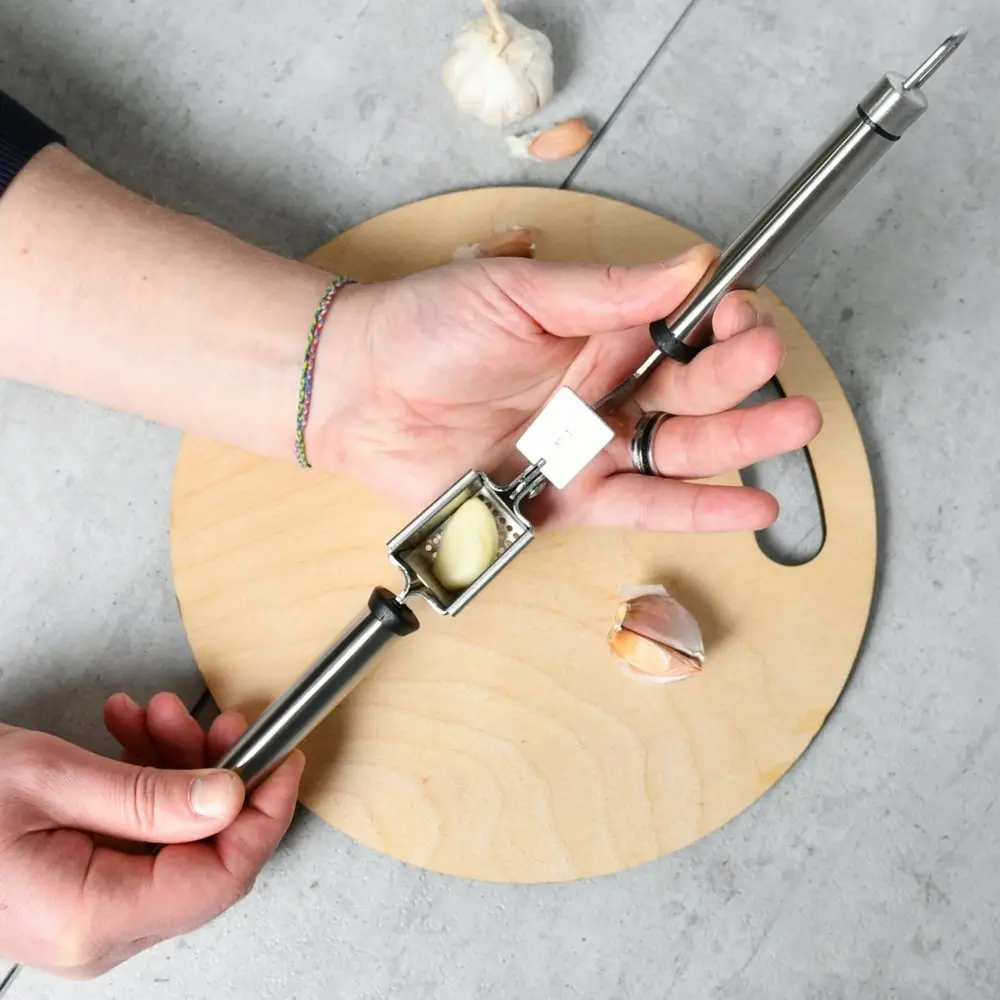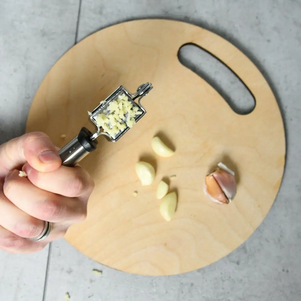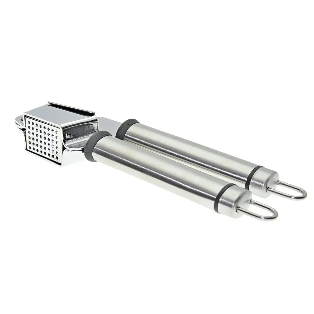 Измельченный чеснок — неотъемлемая часть многих блюд, он придает особый вкус продуктам и их сочетаниям. Для измельчения зубчиков традиционно используется чесноковыжималка — специальный пресс для чеснока. Изделие состоит из чаши с отверстиями и пресса, имеет две удобные ручки. На ручках есть петли, за которые инструмент можно повесить на крючки. Изготовлено: рабочая часть из хромированной стали, ручки из коррозионностойкой (нержавеющей) стали. После применения рекомендуется мыть мягкой щеткой с использованием жидких моющих средств.