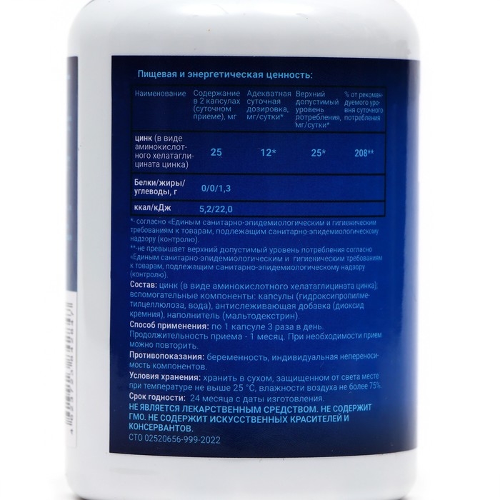 Каждая капсула содержит 0,5 г аминокислотного комплекса цинка. Это форма цинка, которая легче усваивается организмом и не вызывает побочных эффектов, таких как расстройство желудка.