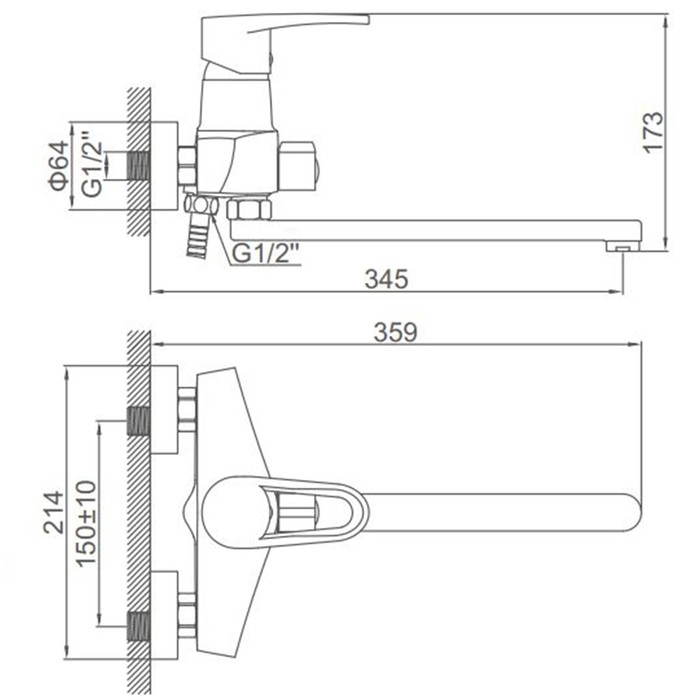 Настенный смеситель имеет длинный поворотный излив и рычаг для регулирования подачи воды. Режим «Душ» переключается поворотом вентиля.