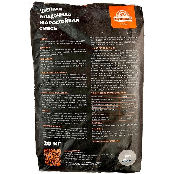 Цветная кладочная жаростойкая смесь "Печникъ" цвет графит 20 кг (срок хранения не ограничен)