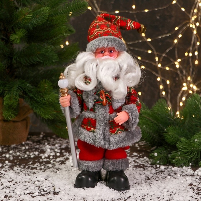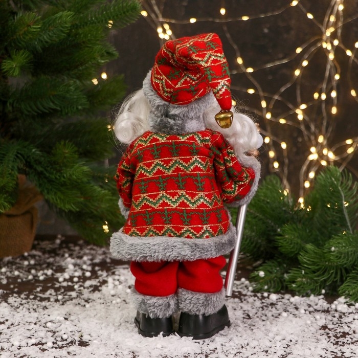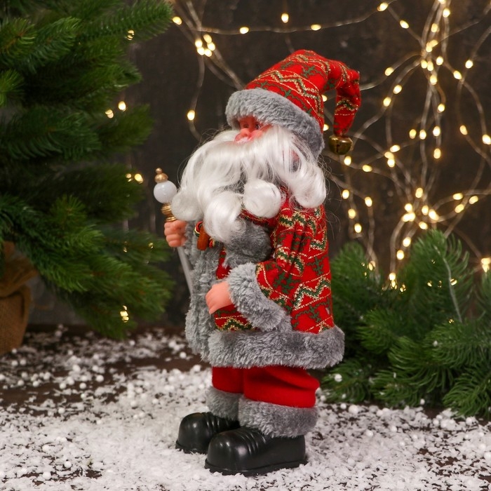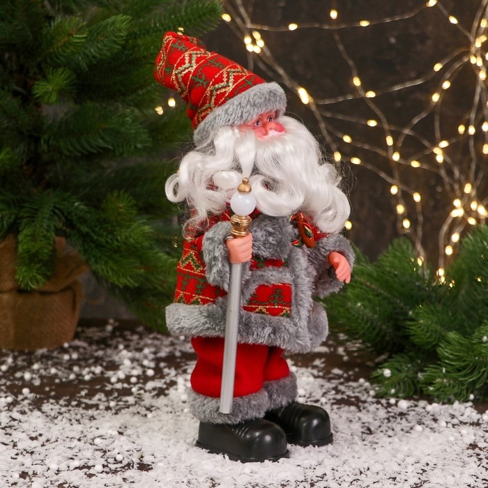 Дед Мороз "Цветной шубке и с фонариком на посохе" 30 см, двигается, красно-серый
