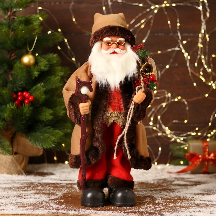 Дед Мороз "В коричневой шубке, с посохом" двигается, 20х40 см