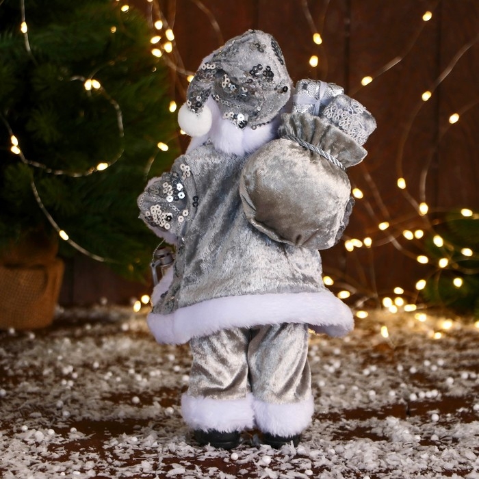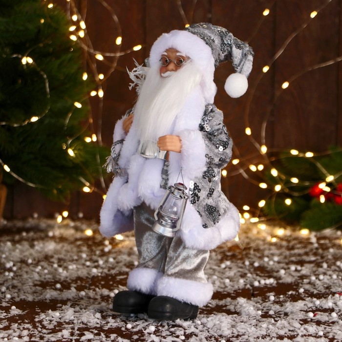 Дед Мороз "В костюме с пайетками и с фонарём" 30 см, серебро
