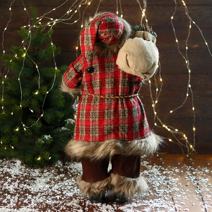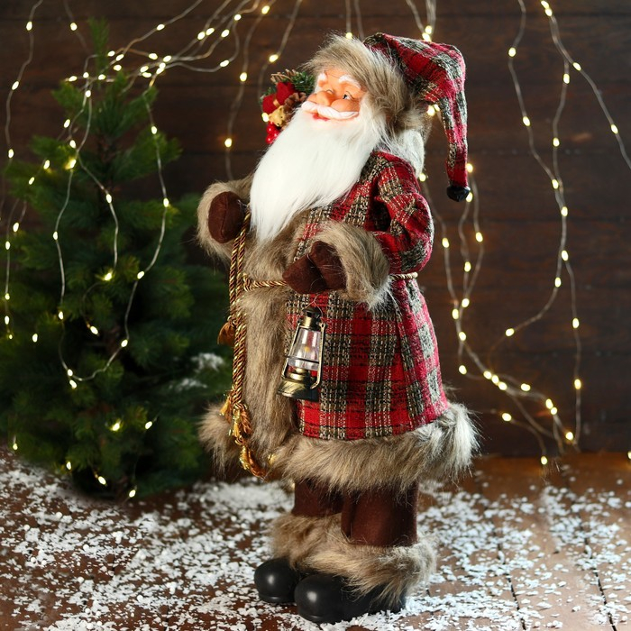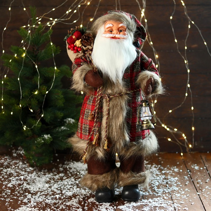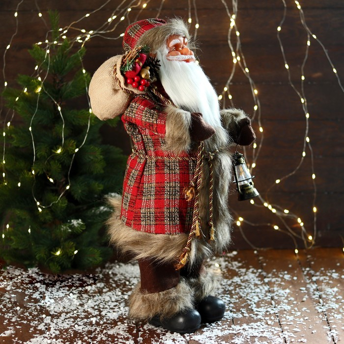 Дед Мороз "В красной клетчатой шубке, с фонариком/ c веточками" 60 см