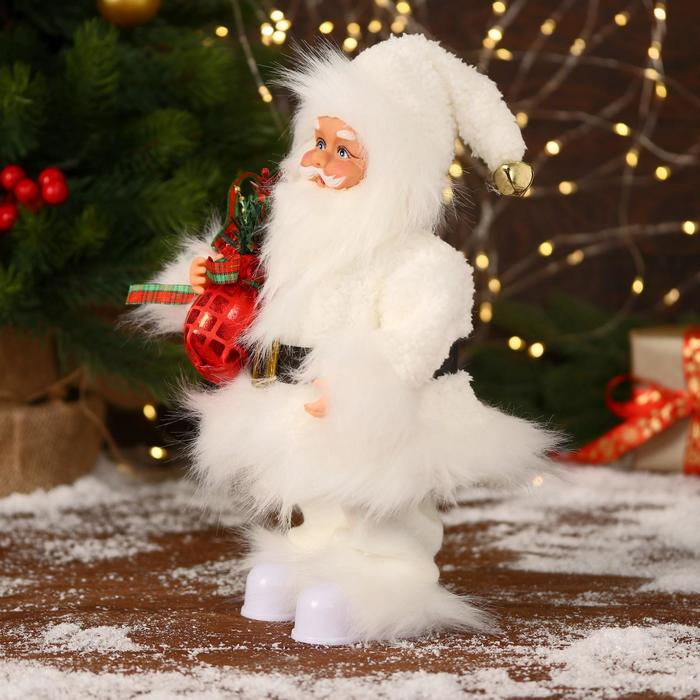 Дед Мороз "В меховом белом костюмчике, с мешком" двигается, 11х30 см