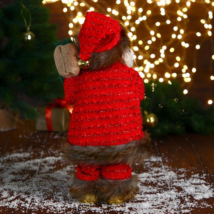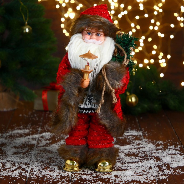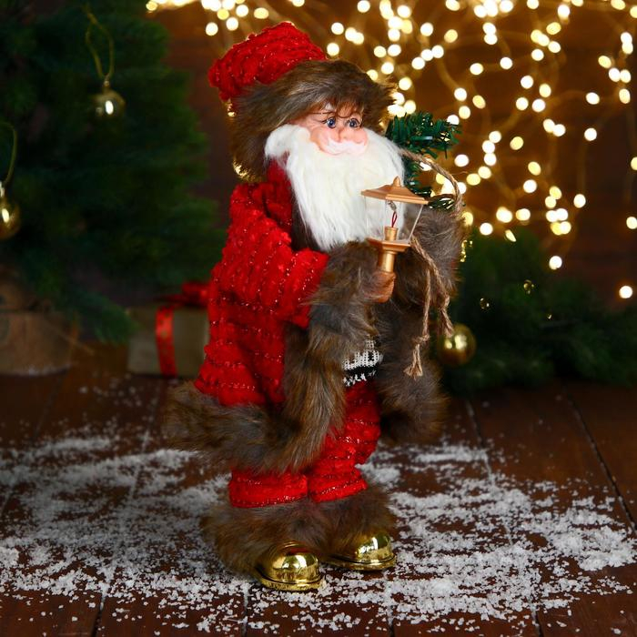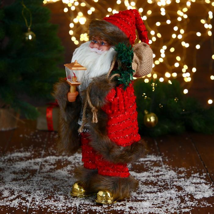Дед Мороз "В свитере и шубке с коричневым мехом" двигается, фонарь светится, 15х35 см