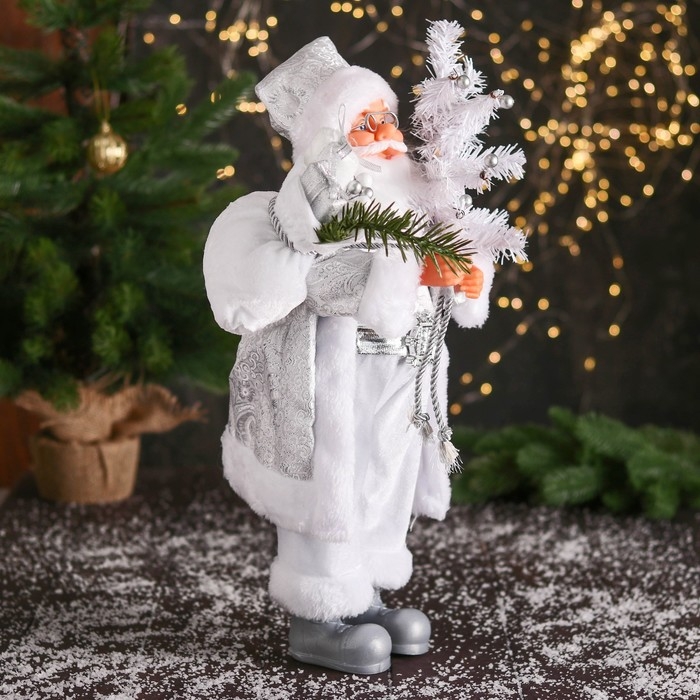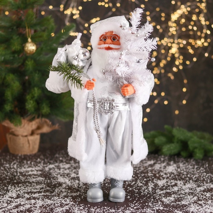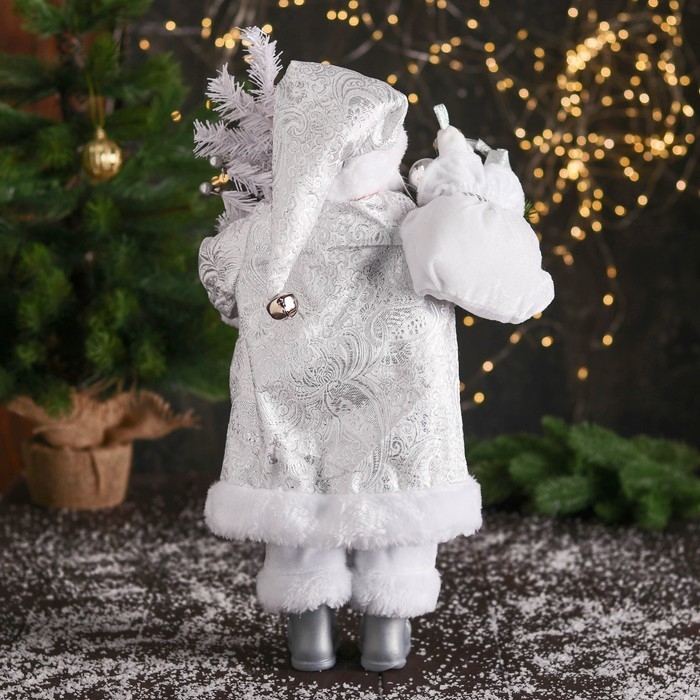 Дед Мороз "В высоком колпачке, в ремешке и с мешком" 44 см, серебристо-белый