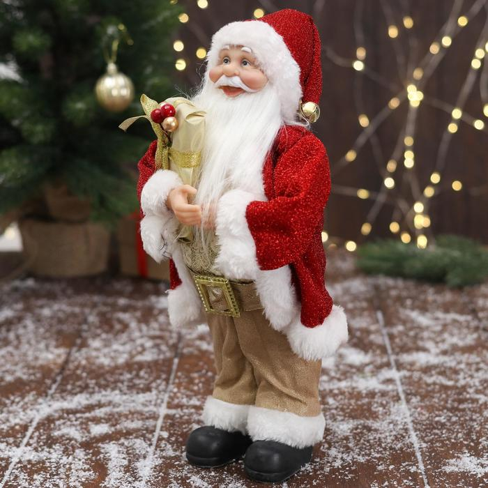 Дед Мороз "В золотисто-красном костюме, с ремешком, с подарками" 15х30 см