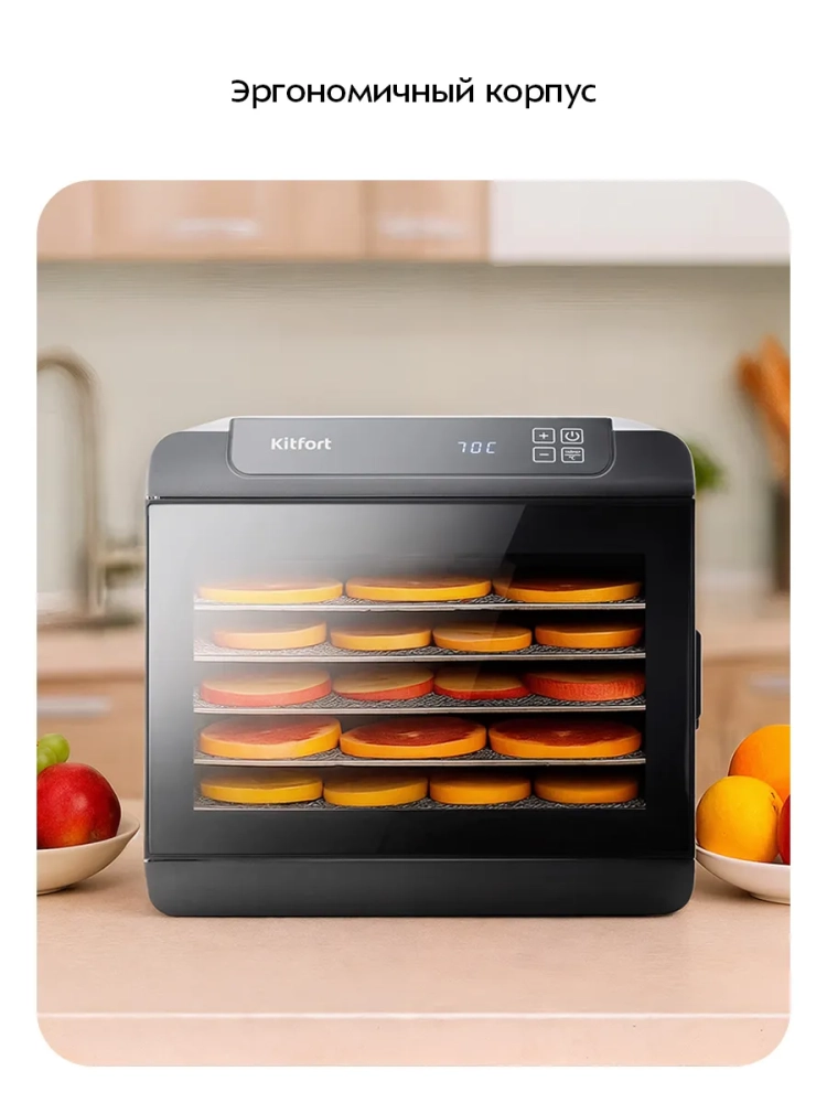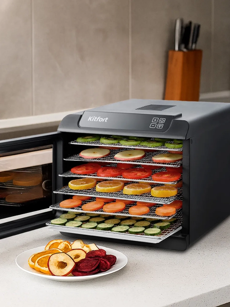 Электрическая сушилка для овощей и фруктов Kitfort КТ-1904 — это универсальный кухонный электро-прибор, который станет незаменимым помощником на вашей кухне. Этот дегидратор предназначен для сушки различных продуктов: овощей, фруктов, ягод, грибов и даже мяса и рыбы. Благодаря мощному нагревательному элементу и вентилятору большого диаметра, электросушилка обеспечивает равномерное распределение горячего воздуха по всей камере. Это позволяет минимизировать смешение запахов при одновременной сушке разных продуктов. Сушилка оснащена 6 поддонами из нержавеющей стали, что делает её долговечной и устойчивой к коррозии. В комплект также входит специальный поддон для жидкости, который идеально подходит для приготовления пастилы или других жидких блюд. Дополнительная сетка позволяет удобно размещать мелкие продукты без риска их выпадения. Температура сушки регулируется в диапазоне от 35 до 70 градусов Цельсия с шагом в 5 градусов, что даёт возможность подобрать оптимальные условия для каждого типа продукта. Таймер работы прибора можно установить до 19,5 часов с шагом в 30 минут — это удобно для длительной сушки больших объёмов. Эта овощесушилка от Kitfort не только функциональна, но и экономична: она потребляет всего 500 Вт энергии при высокой производительности. Сушка овощей или фруктов теперь станет простым процессом благодаря этому надежному бытовому устройству. Используйте эту сушилку как дегидратор для пастилы или просто как электросушилку для ежедневных нужд на кухне! Независимо от того готовите ли вы сухофрукты или грибы — этот прибор справится со всеми задачами.