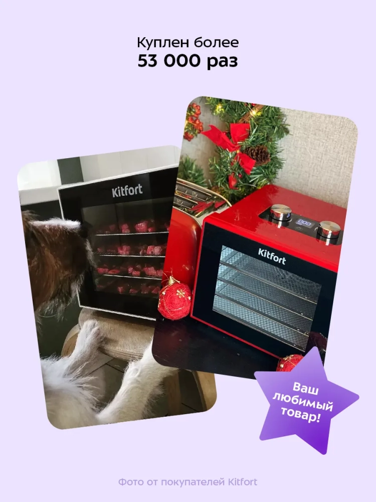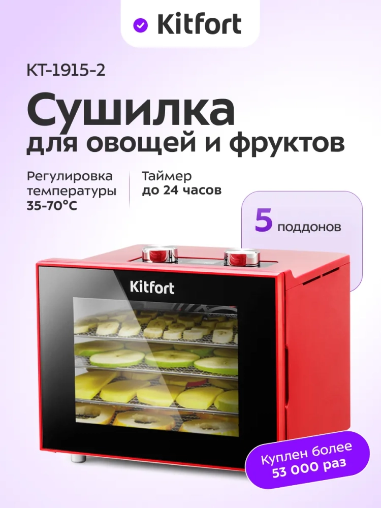 Электросушилка Kitfort КТ-1915 — это универсальный электрический бытовой прибор, который станет незаменимым помощником на вашей кухне. Она предназначена для сушки различных продуктов, таких как овощи, фрукты, ягоды и грибы. Благодаря этому устройству вы сможете сохранить все полезные свойства ваших любимых фруктов и овощей на долгое время. Сушилка также подходит для обработки мяса и рыбы, что делает её идеальным выбором для любителей домашних заготовок. С помощью специального поддона можно готовить пастилу из фруктов или ягод. В комплект входят 4 поддона из нержавеющей стали и один поддон для жидкости, что позволяет одновременно сушить разные продукты без смешения запахов благодаря горизонтальному обдуву воздуха. Мощный нагревательный элемент в сочетании с вентилятором большого диаметра обеспечивает равномерное распределение тепла по всей камере сушилки. Это гарантирует качественную сушку каждого продукта без потери вкусовых качеств. Температура сушки регулируется в диапазоне от 35 до 70 градусов Цельсия с шагом в 5 градусов, что позволяет точно настроить процесс под каждый вид продукта. Электросушилка оснащена таймером до 24 часов работы с шагом в один час — это удобно для планирования времени приготовления заготовок. Овощесушилка Kitfort КТ-1915 отличается простотой использования и надежностью. Этот дегидратор идеально подходит не только для домашнего использования, но и станет отличным подарком любителям здорового питания или тем, кто увлекается кулинарией. Дигидратор поможет вам наслаждаться вкусными домашними заготовками круглый год!
