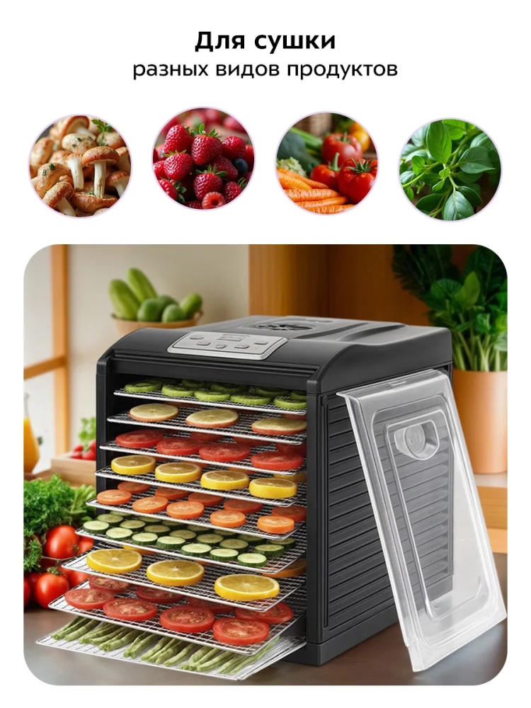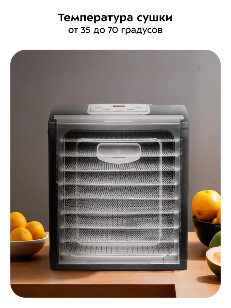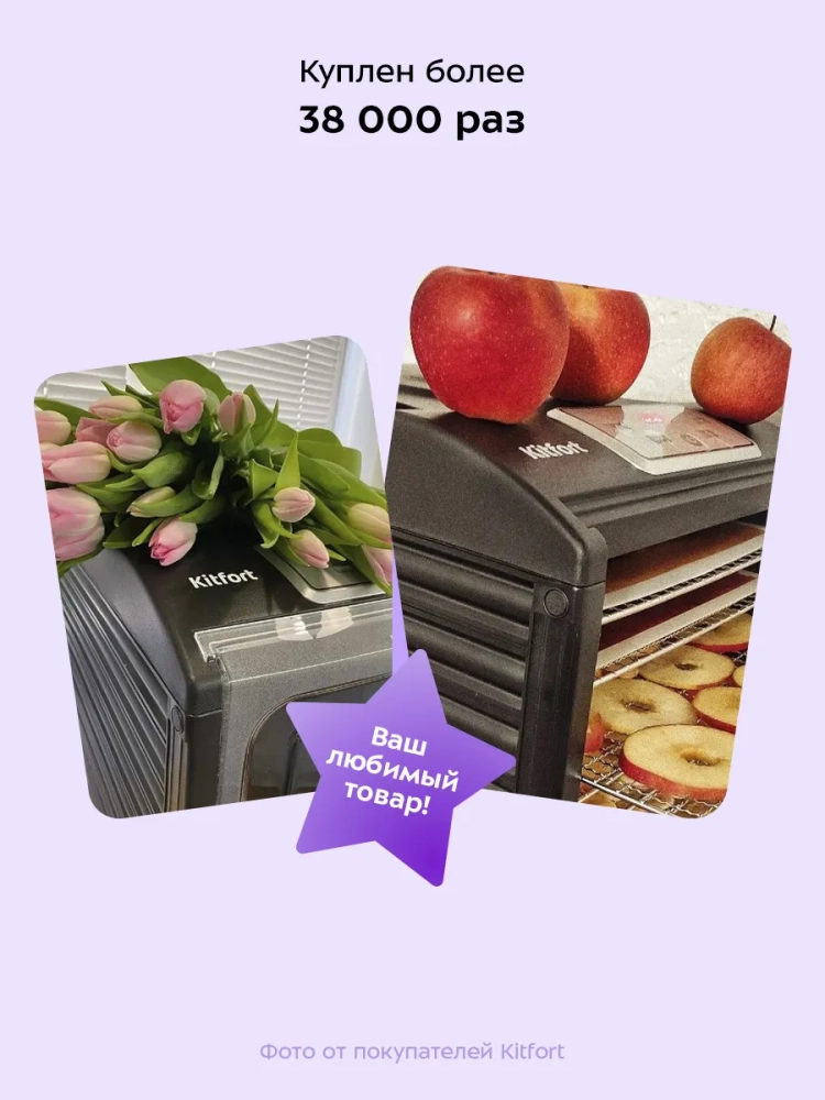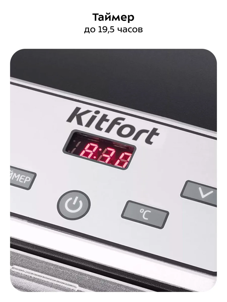 Электросушилка Kitfort КТ-1908 — это универсальный электрический кухонный прибор, предназначенный для сушки различных продуктов, таких как овощи, фрукты, ягоды и грибы. Этот дегидратор также подходит для обработки корнеплодов, трав и зелени. Идеальный подарок на любой случай: на Новый год, 23 февраля, 8 марта, день рождения, свадьбу или юбилей! Благодаря специальному поддону можно готовить пастилу из фруктов или овощей. В комплекте сушилки предусмотрены 9 металлических поддонов и 9 сеток для удобства размещения продуктов. Сушилка оснащена мощным нагревательным элементом и вентилятором большого диаметра. Это обеспечивает равномерное распределение горячего воздуха по всей камере прибора, минимизируя смешение запахов при одновременной сушке разных видов продуктов, но не мяса. Температура сушки регулируется в диапазоне от 35 до 70 градусов Цельсия с шагом в 5 градусов. Эта электросушилка имеет таймер на работу до 19,5 часов с шагом в полчаса, что позволяет точно контролировать процесс дегидратации. Овощесушилка Kitfort КТ-1908 станет незаменимым помощником на кухне благодаря своей многофункциональности и простоте использования. Поддон для пастилы позволяет расширить возможности использования прибора: вы можете экспериментировать с различными рецептами домашних лакомств из фруктов или овощей. Сетка помогает предотвратить падение мелких кусочков продукта во время процесса сушки. Этот дигидратор идеально подходит не только для любителей здорового питания, но и для тех, кто хочет сохранить урожай на зиму без потери полезных свойств продуктов.