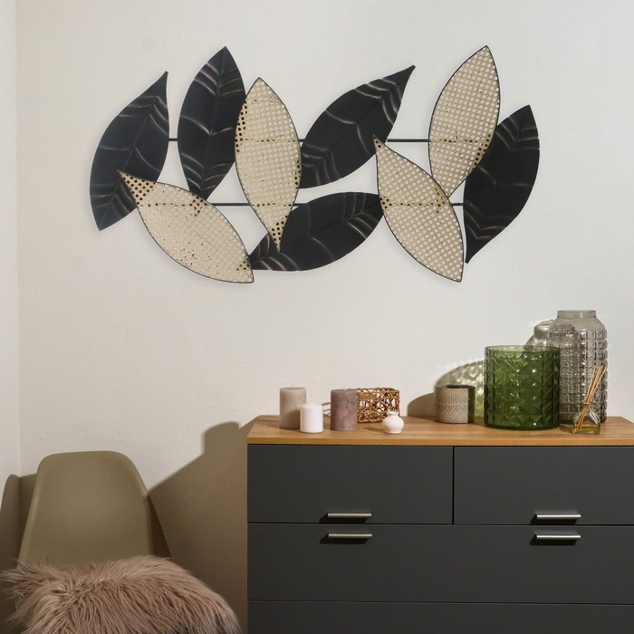 Декор настенный металл "Листья. Точки" чёрный с золотом 105х55 см