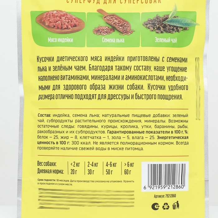 Натуральное мясное лакомство создано специально для дрессуры собак. В отборное мясо индейки мы добавили полезные семена льна. Сочетание диетического мяса и большого количества витаминов, аминокислот и антиоксидантов делают это лакомство идеальным для тренировок.