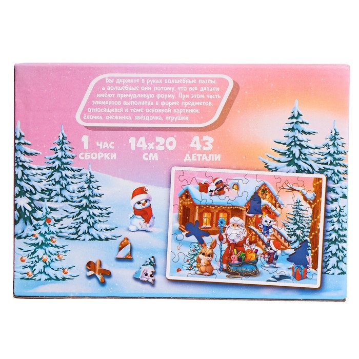 Погрузитесь в новогоднюю сказку с волшебными пазлами! Яркие краски, необычная иллюстрация, экологичный материал. И это еще не всё! Вы только приглядитесь: каждый элемент - это отдельная фигурка со своей историей! При этом некоторые элементы выполнены в форме предметов, относящихся к теме основной картинки.