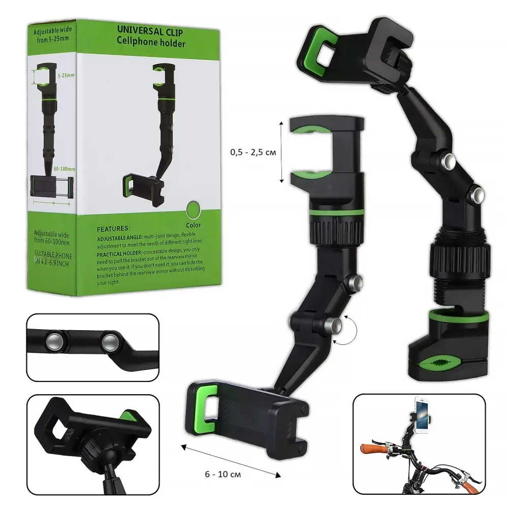 Универсальный держатель предназначен для надежного крепления телефона на велосипеде. Держатель оснащен гибким механизмом, позволяющим легко менять угол наклона для оптимального обзора, а также удобной системой фиксации: достаточно потянуть за чувствительный механизм, чтобы закрепить или освободить устройство. Ширина захвата регулируется в диапазоне 6-10 см, что делает его совместимым с большинством моделей смартфонов. Прочная конструкция и надежные зажимы обеспечивают устойчивость даже при тряске, а компактный дизайн не мешает обзору. Идеальное решение для велосипедистов ценящих удобство и функциональность.