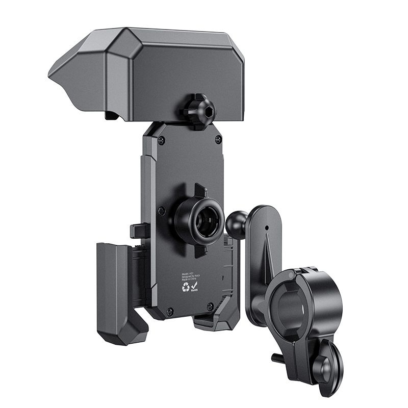 hoco. H31 Wild wolf-это прочный зажимной держатель для Телефона / телефона, предназначенный для крепления на раме велосипеда, скутера, скутера или мотоцикла / мотоцикла. Кронштейн также может быть установлен на раме детской коляски и диапазон диаметров рамы должен быть в диапазоне от 18 до 32 мм. Крепление имеет подпружиненное положение верхних и нижних рычагов в форме зажима и козырек, защищающий от неблагоприятных погодных условий, таких как дождь или снег.