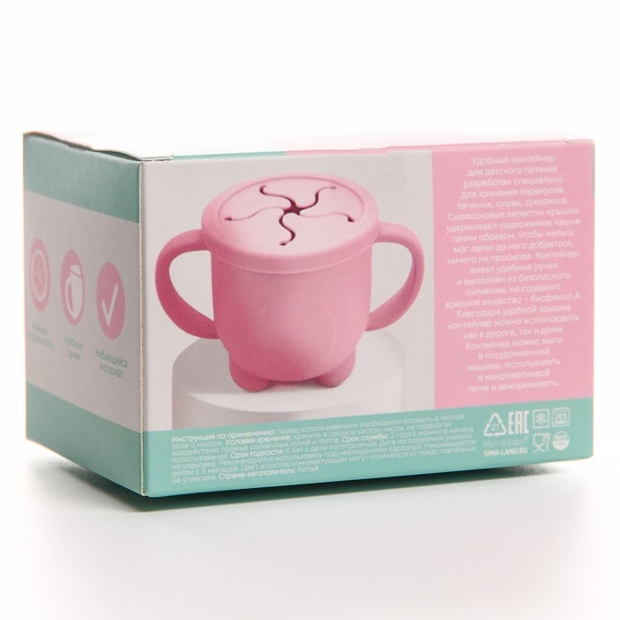 Контейнер подходит для хранения детских снеков . C ним малыш может перекусить тогда, когда захочет.В контейнере можно хранить еду в течении всего дня, поскольку через силиконовую крышку поступает кислород, благодаря чему продукты остаются свежими.