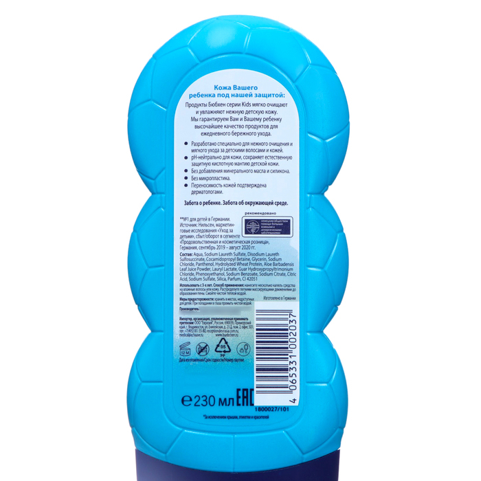 Шампунь и гель для душа «Юный спортсмен» 2 в 1 мягко очищает. Он рН - нейтрален для кожи и сохраняет естественный защитный барьер нежной детской кожи. Для ежедневного ухода за кожей и волосами. Без спутанных волос, без слез.