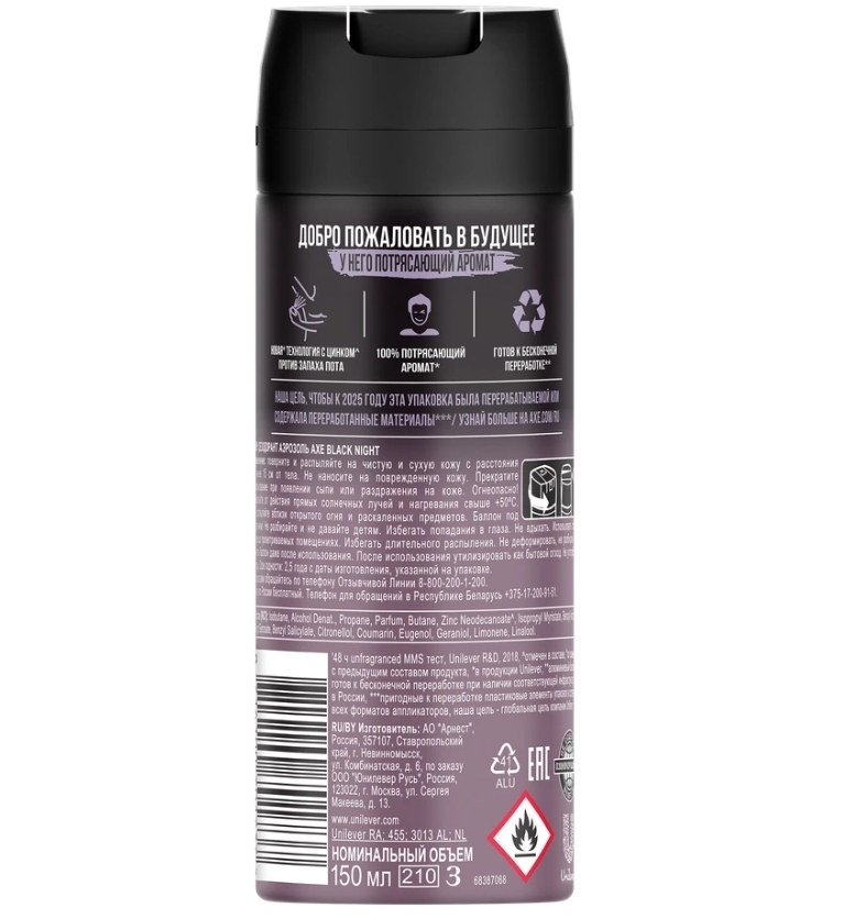 Дезодорант-антиперспирант спрей AXE Black Night – это теплый аромат ванили, элегантные древесные ноты с пикантной остротой душистого перца, элеми и кардамона для загадочного и утонченного мужчины. Не оставляет следов и пятен на одежде и не блокирует потовые железы, придавая уверенность в себе на весь день, каждый день и в любой ситуации. Состав: Isobutane, Alcohol Denat, Propane, Butane, Benzyl Alcohol, Benzyl Salicylate, Butylphenyl Methylpropional, CItral, CItronellol,Geraniol, Coumarin, Limonene, Linalool.