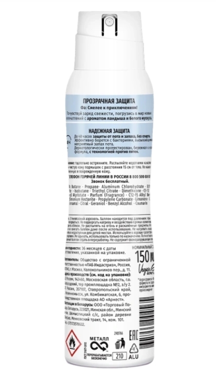Дезодорант-антиперспирант спрей женский ФА Прозрачная защита ‒ смелее к приключениям! Почувствуйте заряд свежести, погрузись в мир новых впечатлений с нежным цветочным ароматом. Женский аэрозоль дезодорант-антиперспирант без влажных подмышек и без стресса. До 48 часов защиты от пота и влажных подмышек без спирта. Эффективно борется с бактериями, вызывающими неприятный запах пота. Дерматологически протестирован, бережная к коже формула, с технологией против пятен. Веган формула: не содержит ингредиентов животного происхождения. Состав: Aqua (Water, Eau), Alcohol denat. (32,8% Vol.), Butane, Distarch Phosphate, Cocamidopropyl Betaine, Cetearyl Alcohol, CetrimoniumChloride, Isobutane, Sodium Chloride, Panthenol, PEG-40 Hydrogenated Castor Oil, Parfum (Fragrance), Lactic Acid, Citric Acid.