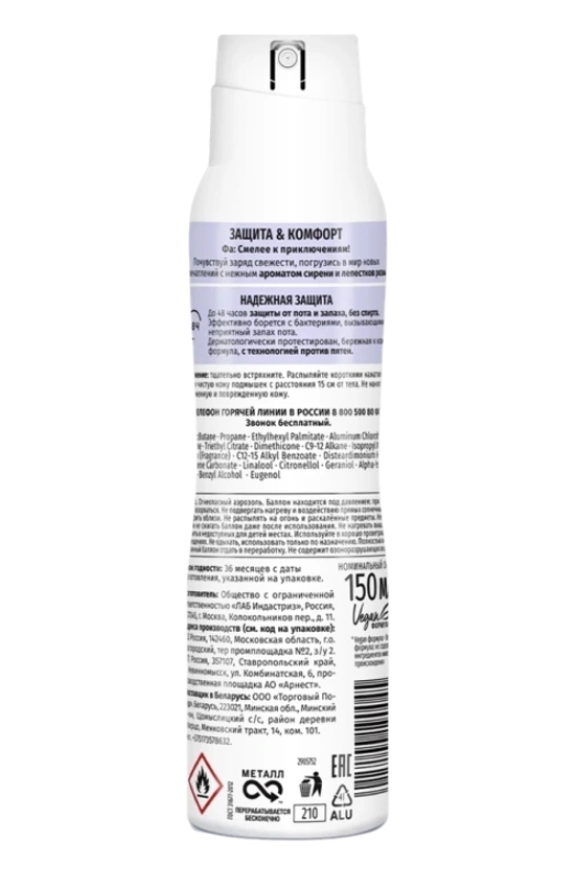 Дезодорант-антиперспирант спрей женский ФА Защита&Комфорт Сирень ‒ смелее к приключениям! Почувствуйте заряд свежести, погрузись в мир новых впечатлений с нежным ароматом сирени. Аэрозоль женский дезодорант-антиперспирант без влажных подмышек и без стресса. До 48 часов защиты от пота и влажных подмышек без спирта. Эффективно борется с бактериями, вызывающими неприятный запах пота. Дерматологически протестирован, бережная к коже формула, с технологией против пятен. Веган формула: не содержит ингредиентов животного происхождения. Состав: Aqua, Butane, Propane, PVP, Chitosan, Lactic Acid, Sodium Benzoate, Cetrimonium Chloride, PEG-40 Hydrogenated Castor Oil,Acrylamidopropyltrimonium Chloride/Acrylamide Copolymer, Panthenol, Isobutane, Phenoxyethanol, Parfum, Amodimethicone, Citric Acid,Hexyl Cinnamal, Butylphenyl Methylpropional, Benzyl Salicylate, Linalool, Ethylhexylglycerin, Benzyl Alcohol, Limonene.