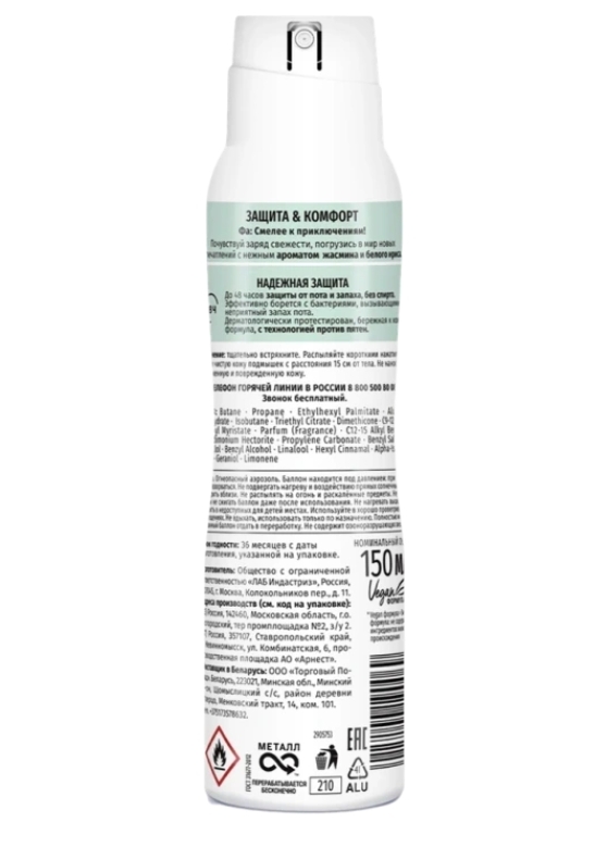 Дезодорант-антиперспирант спрей женский ФА Защита&Комфорт Жасмин ‒ смелее к приключениям! Почувствуйте заряд свежести, погрузись в мир новых впечатлений с нежным ароматом жасмина. Аэрозоль женский дезодорант-антиперспирант без влажных подмышек и без стресса. До 48 часов защиты от пота и влажных подмышек без спирта. Эффективно борется с бактериями, вызывающими неприятный запах пота. Дерматологически протестирован, бережная к коже формула, с технологией против пятен. Веган формула: не содержит ингредиентов животного происхождения. Состав: Aqua (Water, Eau), VP/VA Copolymer, Butane, Propane, Propylene Glycol, Polyquaternium-11, Sodium Benzoate, PEG-40 HydrogenatedCastor Oil, Polyquaternium-4, Parfum (Fragrance), Cetrimonium Chloride, Glycerin, Lactic Acid, Panthenol, Isobutane, Phenoxyethanol,Caprylyl Glycol.