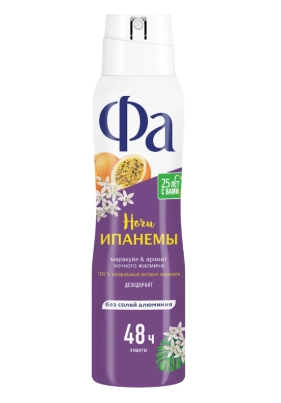 Дезодорант-спрей женский ФА Ритмы Бразилии Ночи Ипанемы ‒ смелее к приключениям! Почувствуйте заряд свежести, погрузись в мир экзотического путешествия с ароматом цветущего ночного жасмина и 100% натуральным экстрактом сочной маракуйи! Женский дезодорант и спрей для тела. До 48 часов ароматизированной защиты без солей алюминия. Эффективно борется с бактериями, вызывающими неприятный запах пота. Дерматологически протестирован, бережная к коже формула, с технологией против пятен. Веган формула: не содержит ингредиентов животного происхождения. Состав: Dimethyl Ether, Alcohol denat. (32,1% Volume), Aqua, Octylacrylamide/Acrylates/Butylaminoethyl Methacrylate Copolymer, AminomethylPropanol, Vinyl Caprolactam/VP/Dimethylaminoethyl Methacrylate Copolymer, Panthenol, Benzophenone-4, Tocopheryl Acetate, Parfum,Limonene, Linalool, Citronellol, Benzyl Alcohol, Alpha-Isomethyl Ionone.