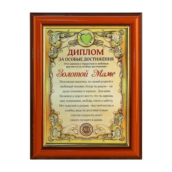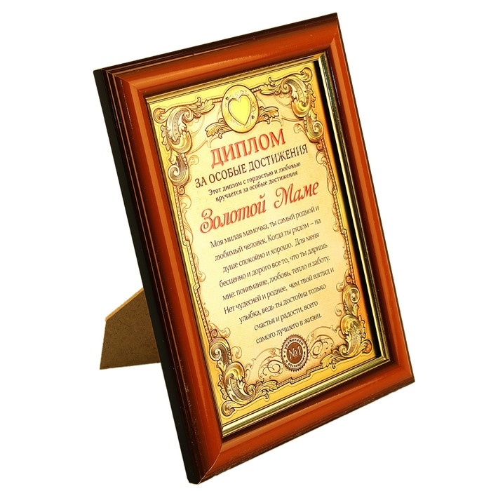 Диплом в рамке "Золотой маме" удобно стоит на любой горизонтальной поверхности, благодаря стандартной подставке. Упакован в картонную коробку с теплым поздравлением на обороте.