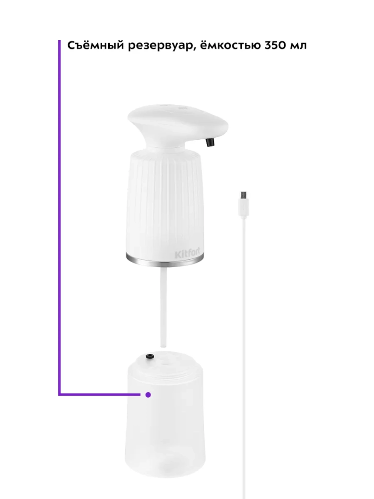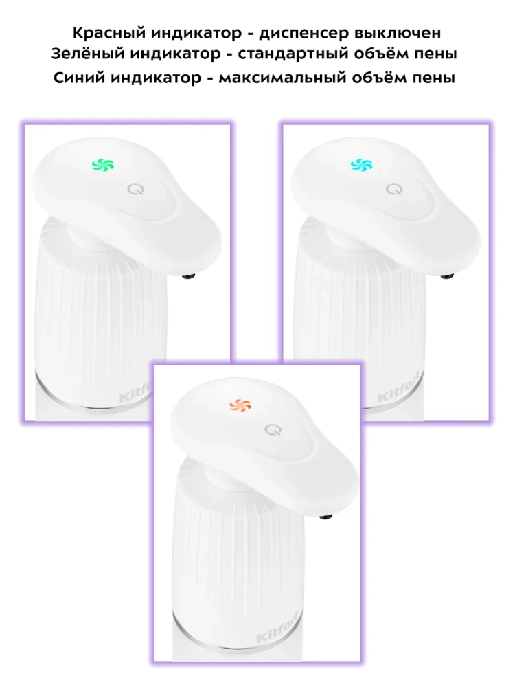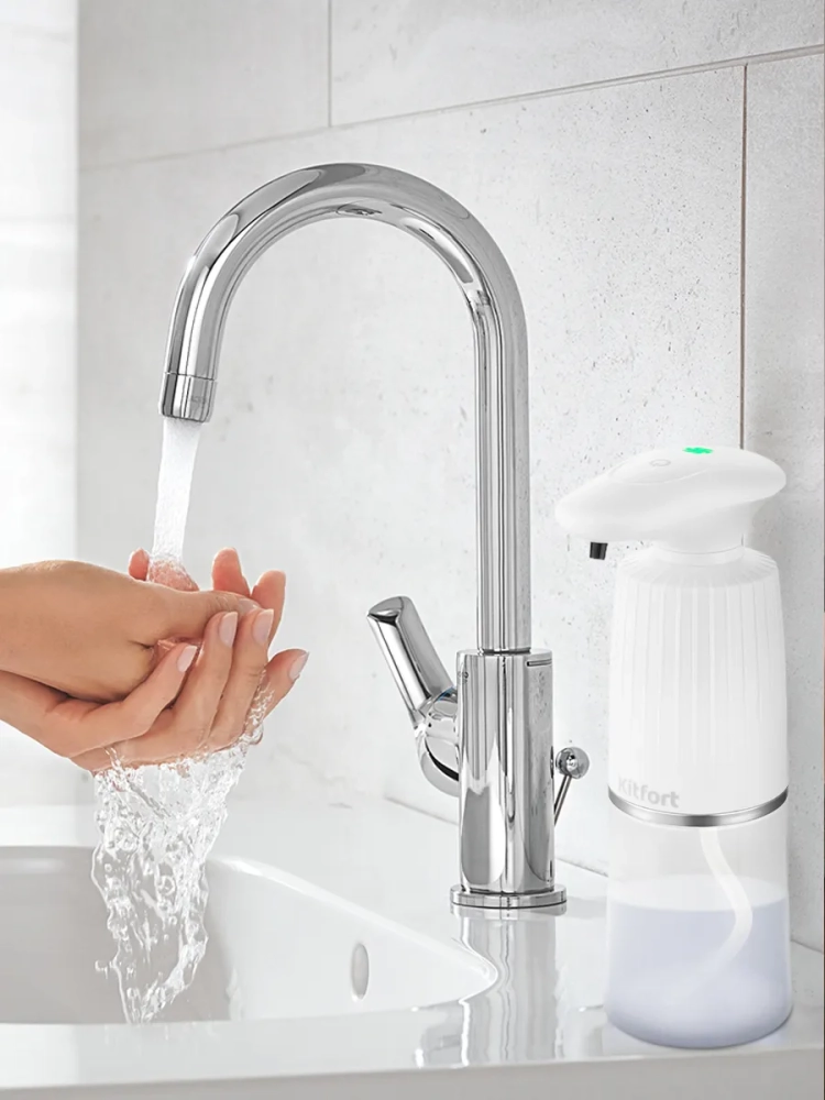 Сенсорный диспенсер для мыла-пены Kitfort КТ-2073 - устройство для порционной выдачи жидкого мыла, жидких моющих и косметических средств в виде пены. Устройство представляет собой резервуар, который наполняется мыльной жидкостью, и механизм дозирования со вспенивателем, который смешивает мыльную жидкость и воздух, тем самым взбивая мыльную пену. Диспенсер оснащен тремя режимами подачи пены - минимальным, стандартным и максимальным, что позволяет регулировать объем выдаваемого средства. Прозрачный резервуар для жидкости позволяет отслеживать уровень жидкости в диспенсере. Резервуар для жидкости легко отсоединяется от корпуса диспенсера, благодаря чему его легко заправлять. Диспенсер оснащен инфракрасным сенсором, который реагирует на поднесение к нему руки, губки для мытья посуды или другого предмета. В отличие от механических моделей, сенсорный диспенсер обеспечивает большую гигиеничность, так как не требует контакта с поверхностью устройства. Достаточно лишь поднести ладонь к носику подачи пены и получить порцию взбитой пены. Устройство работает от встроенного аккумулятора. Заряжать диспенсер можно с помощью кабеля MicroUSB, который идет в комплекте. Диспенсер будет полезен в ванной комнате или на кухне. Его можно использовать для получения пены из жидкого мыла, крем-мыла, средства для мытья посуды, геля для душа или мицеллярной воды. Устройство оснащено защитой от водяных брызг, поэтому его можно поставить даже во влажном помещении. Эргономичная конструкция с широким устойчивым дном и лаконичный дизайн позволяют разместить диспенсер в любом удобном для вас месте - на кухонной столешнице, подставке для умывальника, туалетном столике или полке в ванной.
