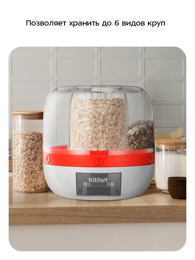 Диспенсер для сыпучих продуктов Kitfort КТ-1279 позволяет хранить в одном месте до 6 видов круп или бобовых. Емкость диспенсера — 7,2 л. Диспенсер сделан из пластика BPA-free, не содержит Бисфенол А, что делает данный вид пластика безопасен для здоровья.