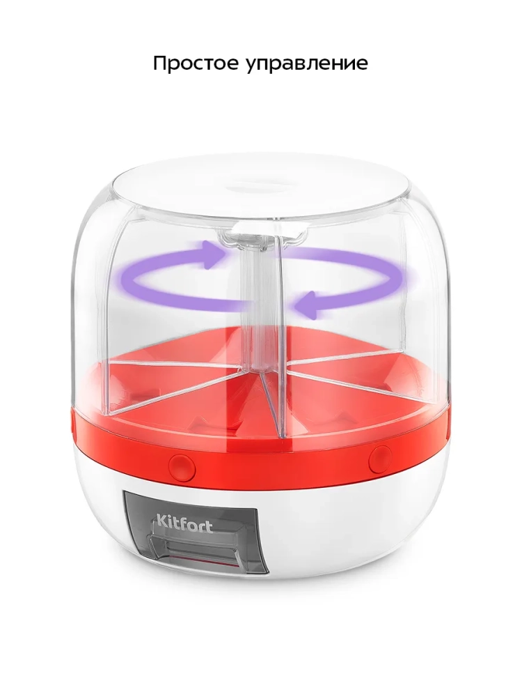 Чтобы найти нужный продукт, вращайте диспенсер с отсеками, расположите отсек с нужным продуктом над съемным контейнером, а затем нажмите на кнопку отсека, крупа будет высыпаться, пока вы удерживаете кнопку.