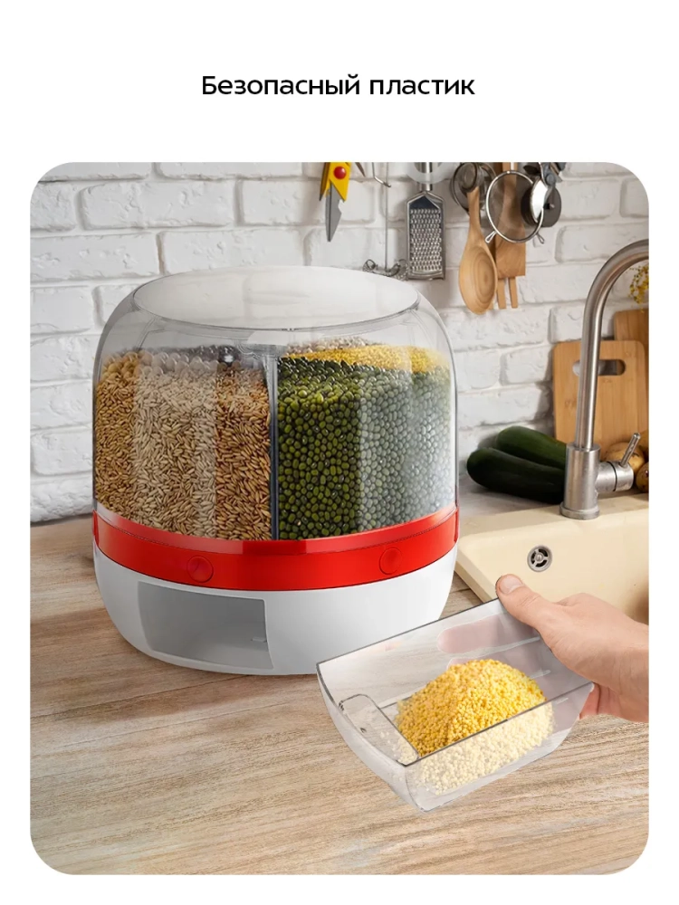 Диспенсер состоит из 6 прозрачных отсеков, крышки и съемного контейнера. У съемного контейнера есть удобный носик для высыпания. Под крышкой есть отсек для приправ, в который можно положить ароматные специи, например анис, что позволит предотвратить появление насекомых, которые иногда заводятся в крупах.