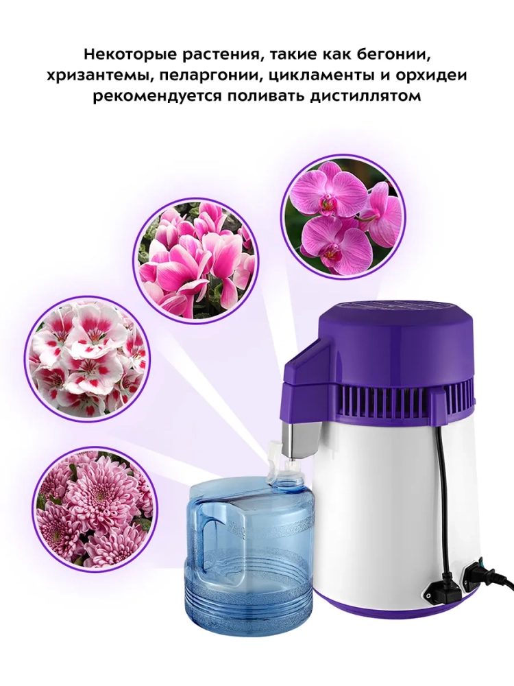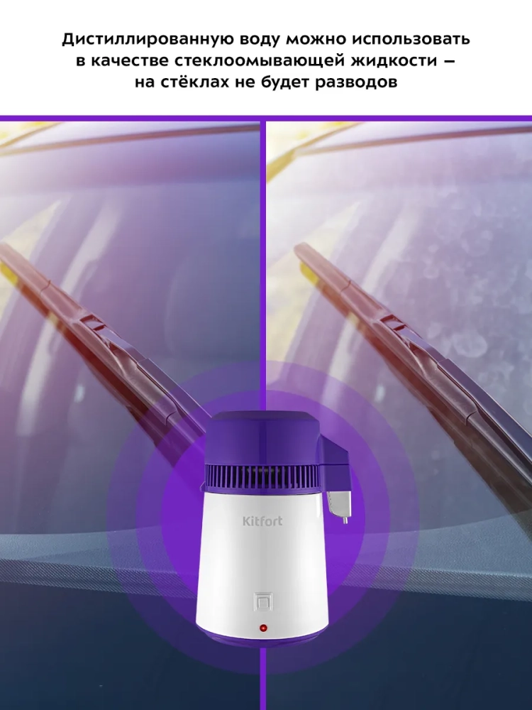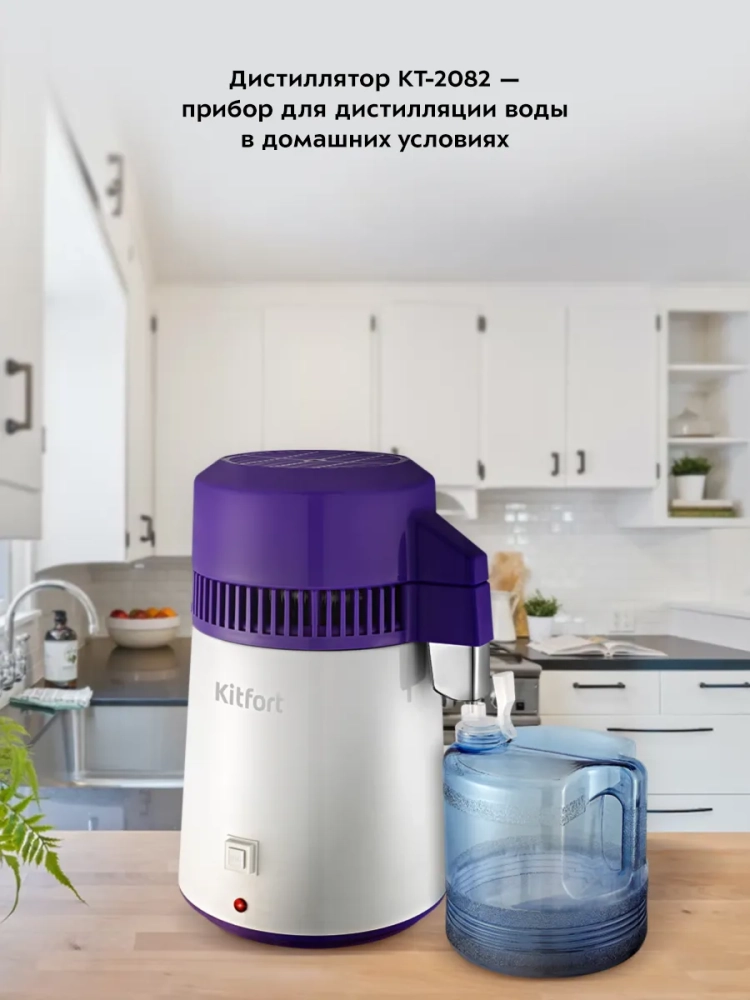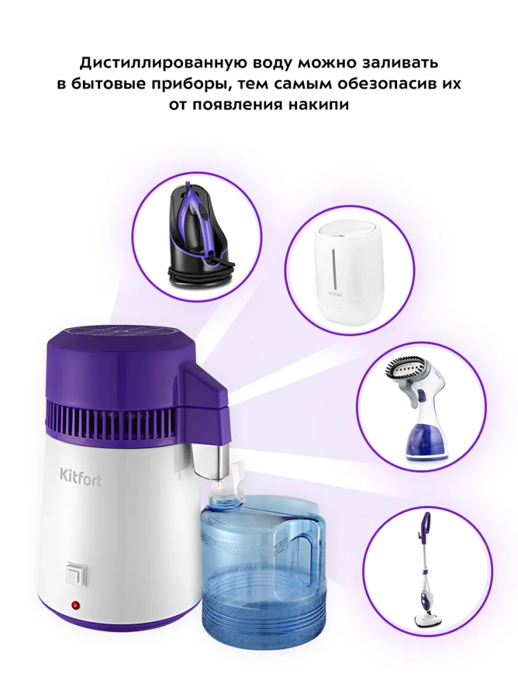 Дистиллятор Kitfort KT-2082 — это прибор для дистилляции воды в домашних условиях. Данное устройство очищает воду от хлора, различных бактерий, металлов и других вредных для организма веществ. Дистиллированная вода очень полезна в быту. Ее можно заливать в утюги, отпариватели, увлажнители воздуха, паровые швабры и прочие бытовые приборы, тем самым обезопасив их от появления накипи. В косметологии рекомендуется использовать дистиллят как для молодой чувствительной кожи, так и для сухого, тусклого и уставшего кожного покрова, это идеальная основа для сывороток и кремов, которая усиливает эффект от их применения. Некоторые растения, такие как бегонии, хризантемы, пеларгонии, цикламенты и орхидеи рекомендуется поливать дистиллятом. Если у вас есть автомобиль, то дистиллированной водой можно разбавлять антифриз, который уже находится в системе автомобиля, так как вода, содержащаяся в антифризе, со временем испаряется. Дистиллированную воду можно использовать в качестве стеклоомывающей жидкости: если заливать в бачок для стеклоомывающей жидкости простую воду из-под крана или бутилированную воду, то на стеклах будет оставаться белый осадок растворенных в воде солей. От дистиллята пятен и разводов на стеклах не будет. Также дистиллированной водой можно разбавлять омыватели-концентраты, как зимние, так и летние. Существует миф, что пить дистиллированную воду нельзя из-за отсутствия в ней каких-либо минералов. На самом деле пить ее можно, и многие люди используют ее для питья. Дистиллированная вода выводит из организма токсины, а некоторые даже пьют дистиллят для похудения. Но так как вред и польза дистиллированной воды окончательно не доказаны, и споры происходят до сих пор, мы рекомендуем употреблять дистиллированную воду в меру. Благодаря дистиллятору KT-2082 вы сможете получить дистиллированную воду дома. Дистиллятор занимает мало места и очень прост в использовании. Благодаря его простоте и высокой производительности вы забудете о покупках дистиллированной воды.