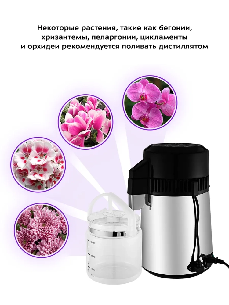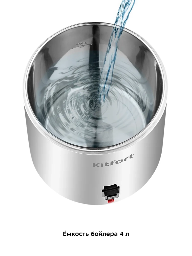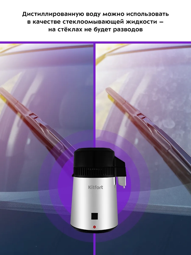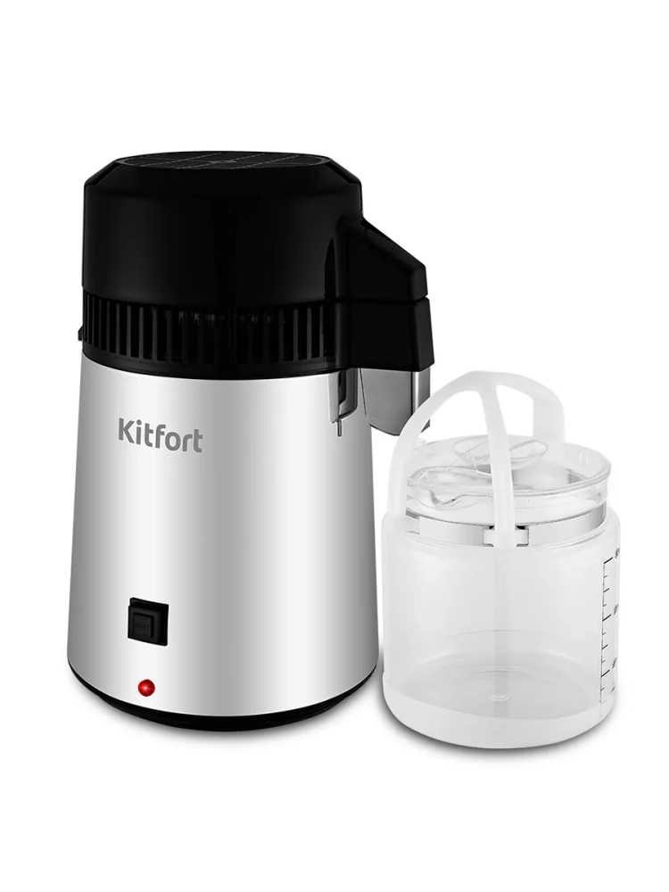 Дистиллятор Kitfort KT-2083 — это прибор для дистилляции воды в домашних условиях. Данное устройство очищает воду от хлора, различных бактерий, металлов и других вредных для организма веществ. Дистилляция — это испарение жидкости с последующим охлаждением и конденсацией паров. Проще говоря, вода наливается в бойлер, там нагревается и испаряется, в бойлере остаются все растворенные в воде соли и минералы, пар попадает в змеевик в крышке, там охлаждается вентилятором и конденсируется, полученный конденсат (дистиллированная вода) стекает в канистру. Все примеси, которые были в воде, остаются в бойлере. Дистиллированная вода очень полезна в быту. Ее можно заливать в утюги, отпариватели, увлажнители воздуха, паровые швабры и прочие бытовые приборы, тем самым обезопасив их от появления накипи. В косметологии рекомендуется использовать дистиллят как для молодой чувствительной кожи, так и для сухого, тусклого и уставшего кожного покрова, это идеальная основа для сывороток и кремов, которая усиливает эффект от их применения. Некоторые растения, такие как бегонии, хризантемы, пеларгонии, цикламенты и орхидеи рекомендуется поливать дистиллятом. Если у вас есть автомобиль, то дистиллированной водой можно разбавлять антифриз, который уже находится в системе автомобиля, так как вода, содержащаяся в антифризе, со временем испаряется. Дистиллированную воду можно использовать в качестве стеклоомывающей жидкости: если заливать в бачок для стеклоомывающей жидкости простую воду из-под крана или бутилированную воду, то на стеклах будет оставаться белый осадок растворенных в воде солей. От дистиллята пятен и разводов на стеклах не будет. Также дистиллированной водой можно разбавлять омыватели-концентраты, как зимние, так и летние. Благодаря дистиллятору KT-2083 вы сможете получить дистиллированную воду дома.