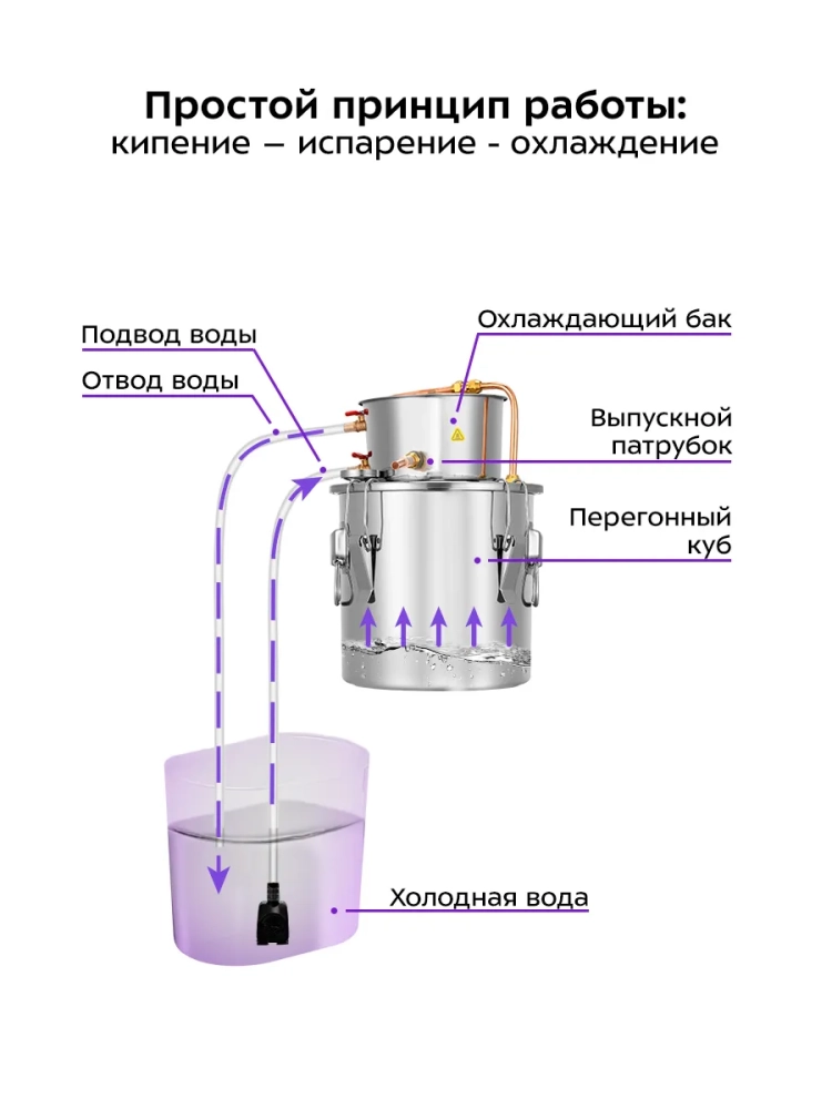 Дистилляция — это испарение жидкости с последующим охлаждением и конденсацией паров. Вода нагревается в перегонном кубе и испаряется, при этом в перегонном кубе остаются все растворенные в воде соли и минералы. Когда пар попадает в змеевик охлаждающего бака, вода в баке охлаждает его, и пар конденсируется. Полученный конденсат вытекает из выпускного патрубка. В данной модели проточная система охлаждения: в охлаждающий бак необходимо подавать холодную воду с помощью водяного насоса (помпы), при заполнении бака воду нужно сливать. Два шланга для воды и насос входят в комплект.