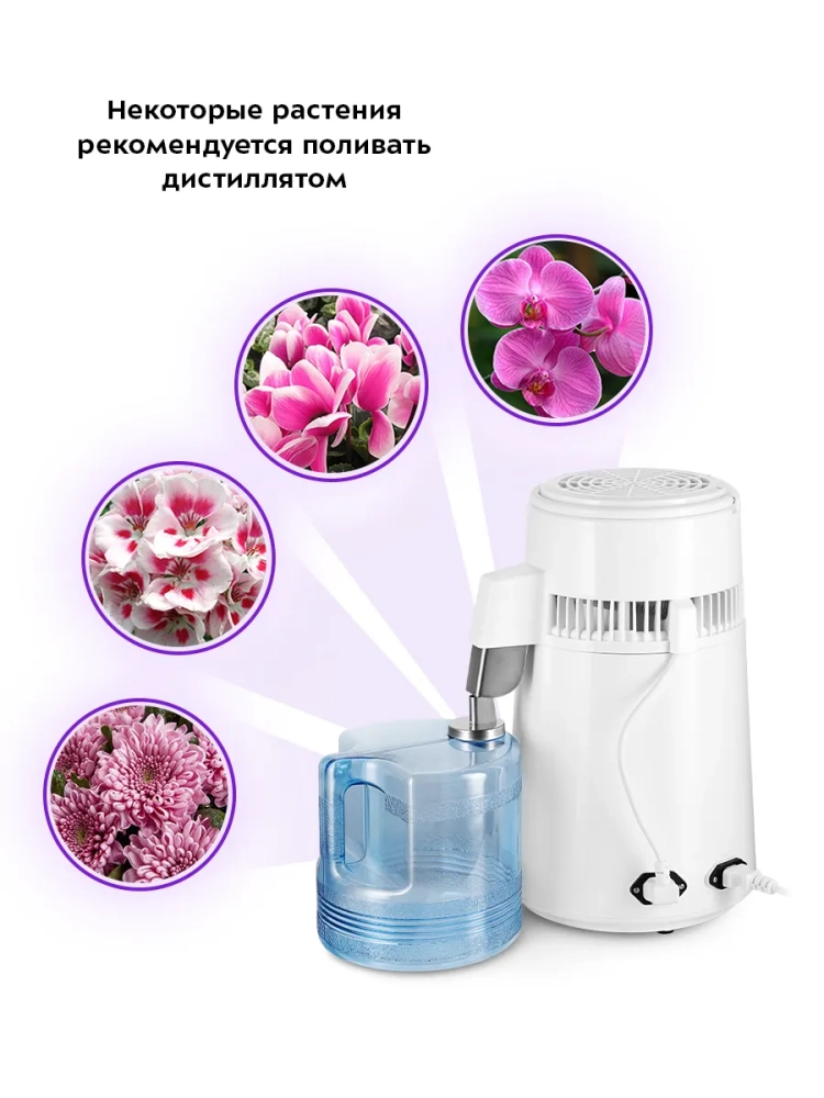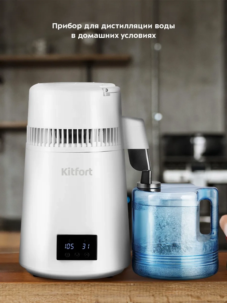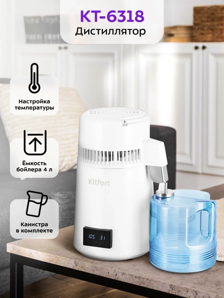 Дистиллятор Kitfort KT-6318 — это устройство для дистилляции воды в домашних условиях. Прибор очищает воду от хлора, различных бактерий, металлов и других вредных для организма примесей.