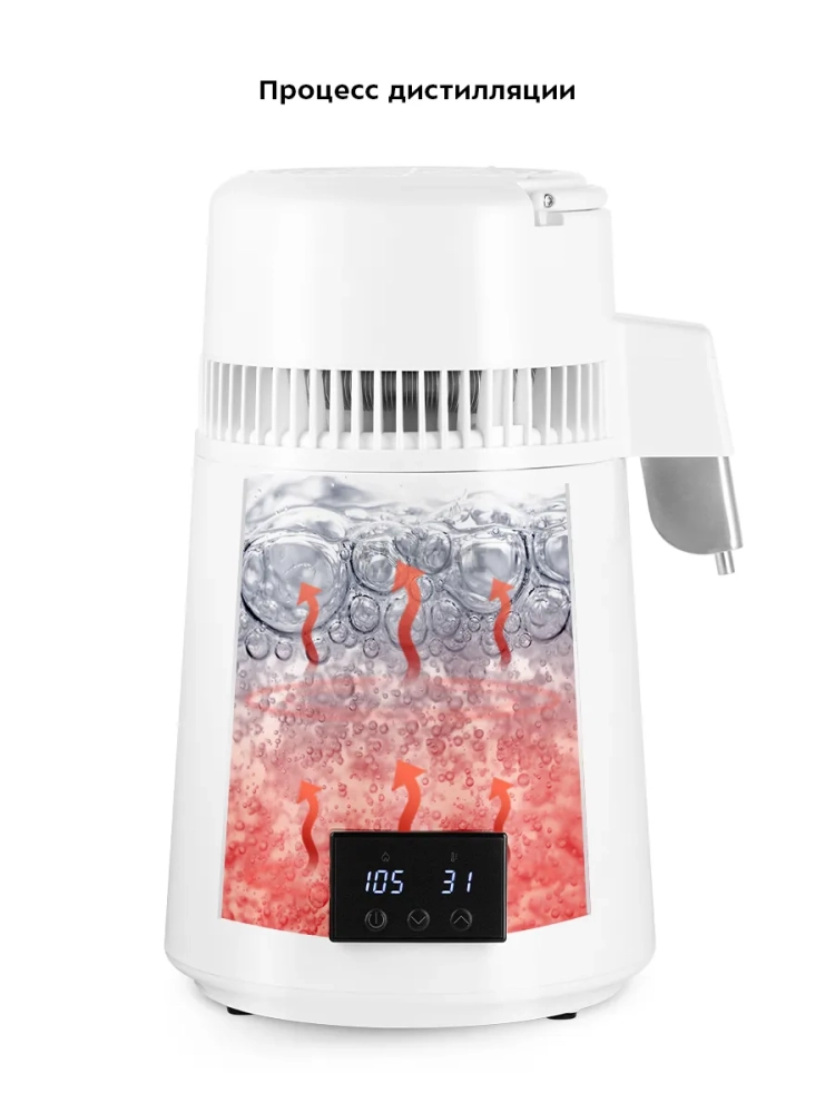 В данной модели дистиллятора вы можете управлять процессом дистилляции благодаря встроенному терморегулятору. Устройство позволяет установить температуру нагрева от 45 до 108 °С с шагом 1 °С, что удобно для дистилляции жидкостей с разной температурой кипения. За счет отображения текущей температуры жидкости в бойлере вы можете контролировать процесс дистилляции.