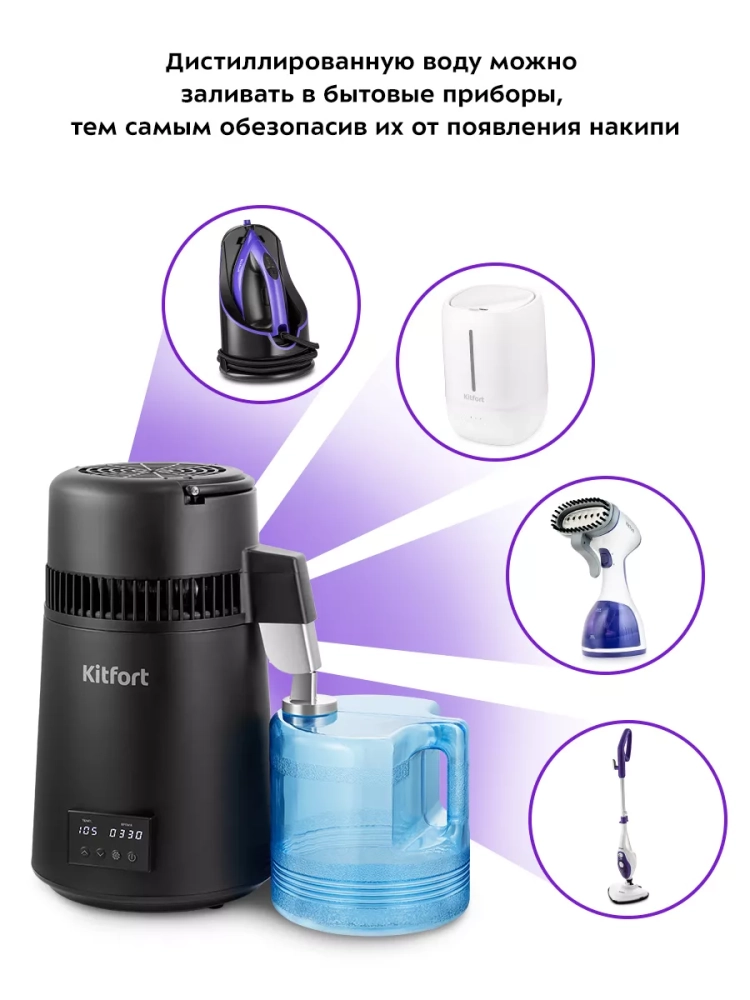 Дистиллятор Kitfort KT-6324 — это устройство для дистилляции воды в домашних условиях. Прибор очищает воду от хлора, различных бактерий, металлов и других, вредных для организма примесей.