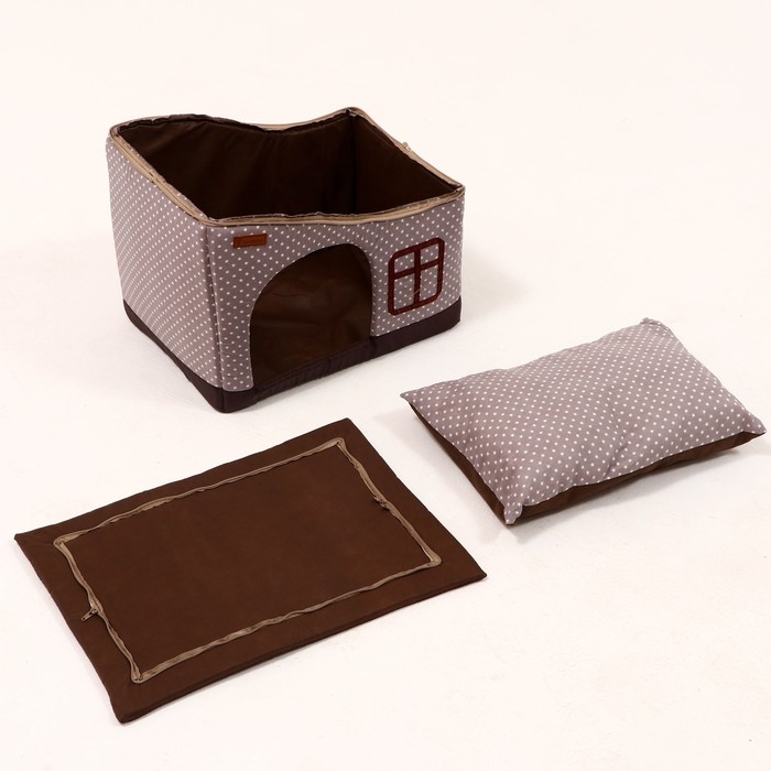 Дом для животных предназначен для комфортногого отдыха и сна вашего питомца. Домик обладает гибкой конструкцией, форму домик держит благодаря поролону на боковых частях. Он выполнен из качественных материалов, которые обеспечивают хорошую вентиляцию и защиту от холода, а внутри дома находится подушка-лежанка. Наполнитель из синтепона делает домик еще более мягким и удобным. За изделием легко ухаживать: можно использовать пылесос или специальный ролик для удаления шерсти. Также можно стирать в машине при температуре 30 градусов в ручном или деликатном режиме, а затем естественным образом расправить и подсушить. Его можно взять с собой в путешествие. Собрать и сложить в багаж, на дачу или на природу в разложенном виде. Ваше животное будет чувствовать себя в нем защищенно и безопасно.