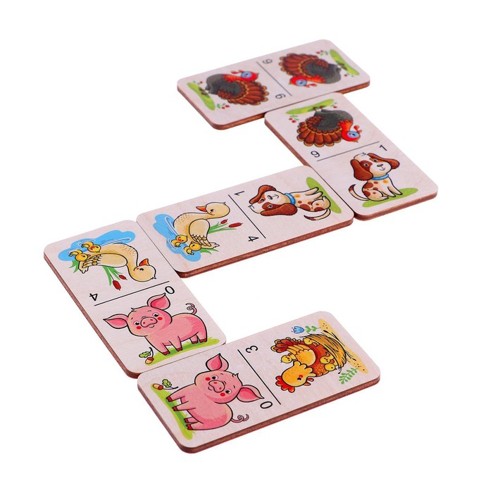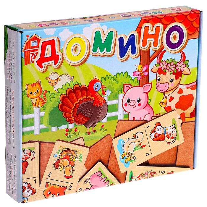 Детское деревянное домино с картинками для малышей производится в России из экологичного материала — отечественной берёзовой фанеры. Развивающая деревянная игра домино — полезная логическая настольная игра, где к изображению на одной фишке необходимо подобрать такое же на другой фишке.