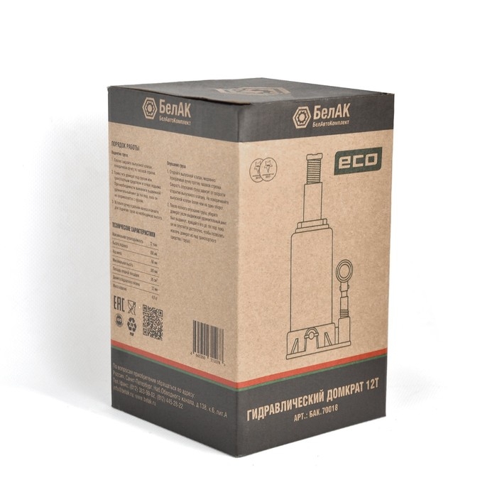 Домкрат ECO 12 тонн «БелАК» БАК.70018 разработан российским производителем «БелАК», награждённым двумя национальными премиями «Автокомпонент года» и «Автоаксессуар года» за высокое качество и надежность выпускаемых домкратов. Продукция «БелАК» соответствуют нормам сертификации ISO9001 и ЕАС.