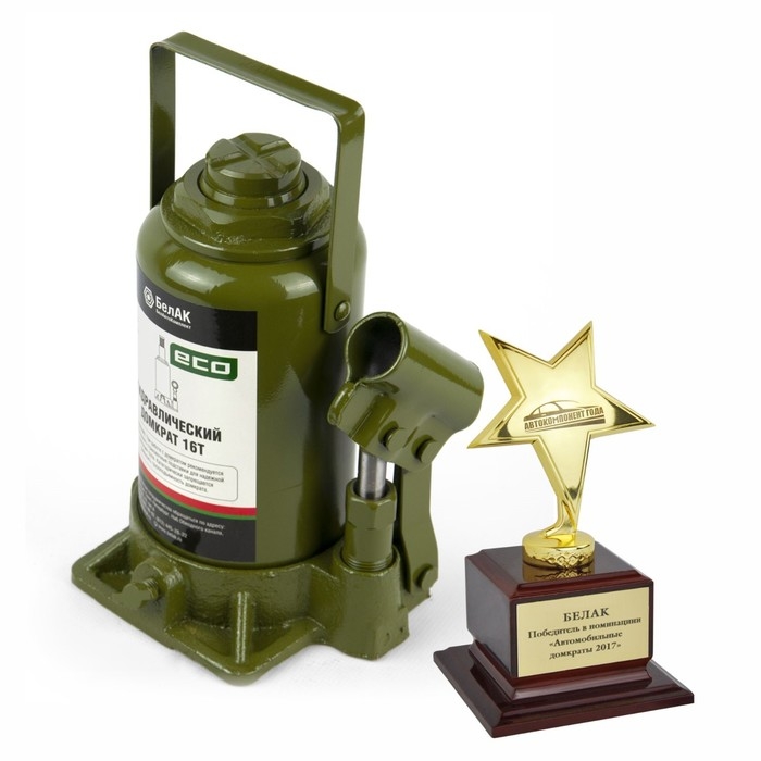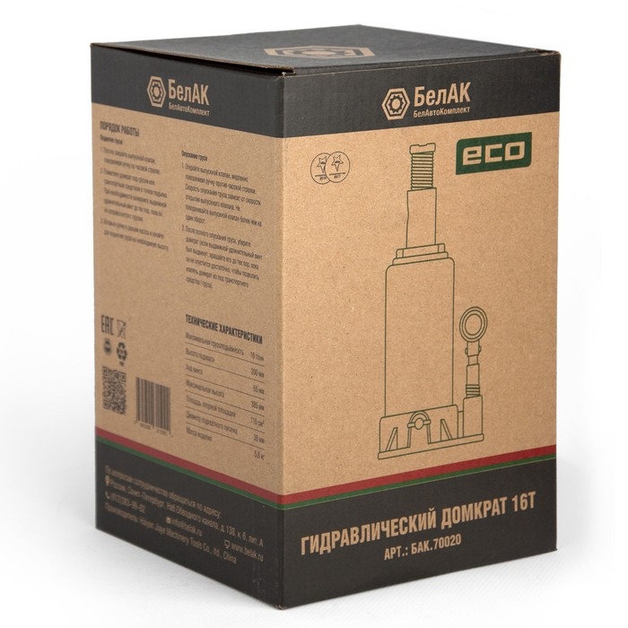 Домкрат ECO 16 тонн «БелАК» БАК.70020 разработан российским производителем «БелАК», награждённым двумя национальными премиями «Автокомпонент года» и «Автоаксессуар года» за высокое качество и надежность выпускаемых домкратов. Продукция «БелАК» соответствуют нормам сертификации ISO9001 и ЕАС.