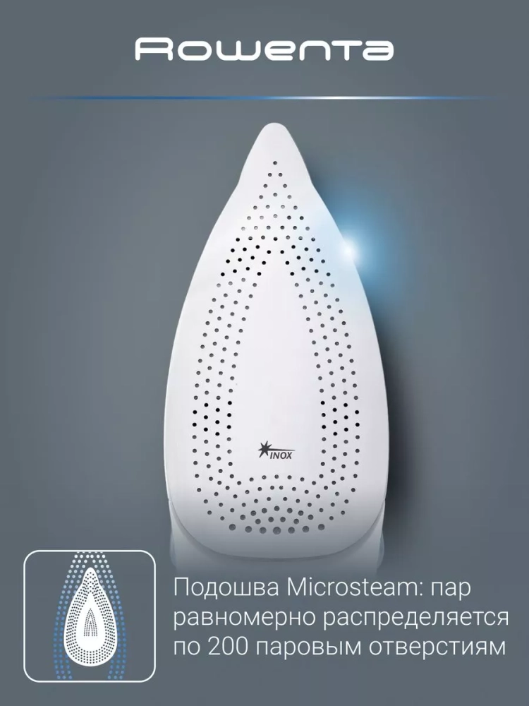 Уникальная запатентованная подошва Microsteam200 гарантирует идеальное распределение пара, а острый носик поможет разгладить складки в труднодоступных местах. Постоянный пар 10 г/мин бережно ухаживает за тканями, а паровой удар 45 г/мин поможет разгладить плотные ткани и стойкие складки.