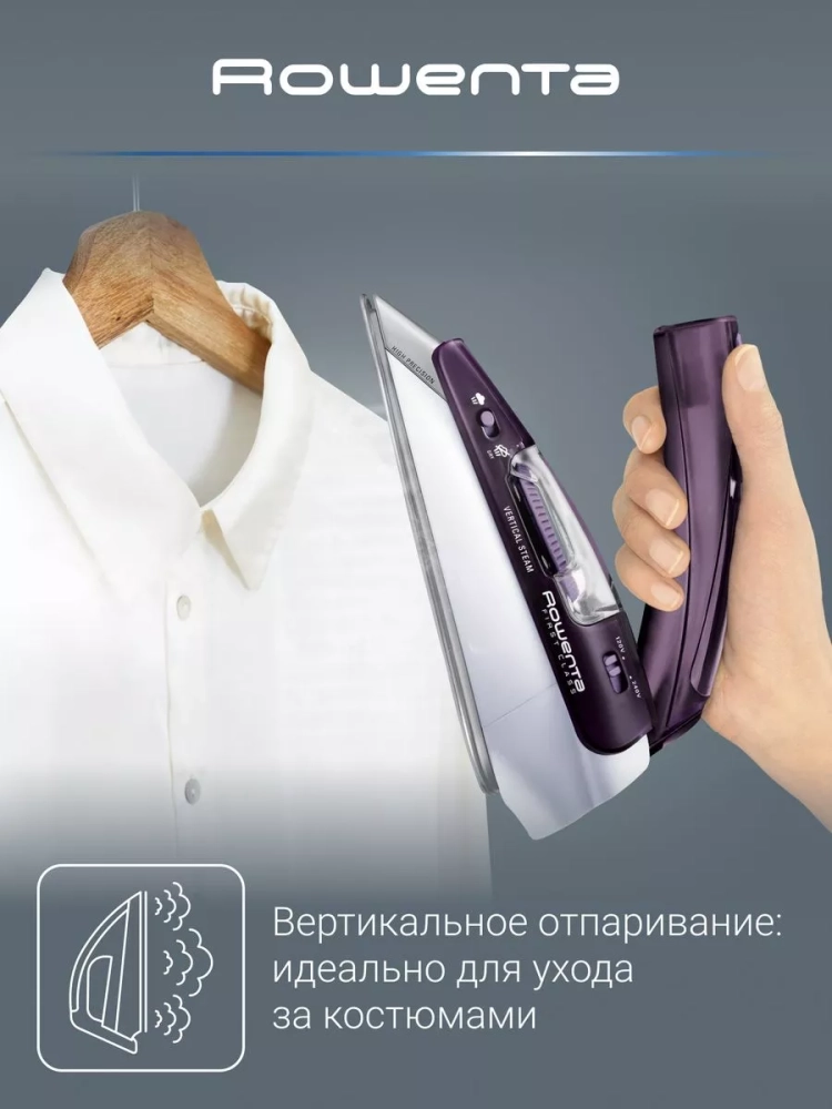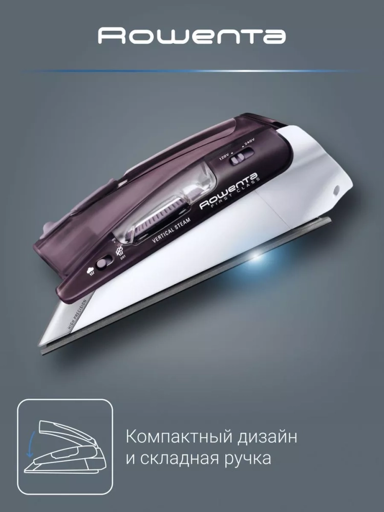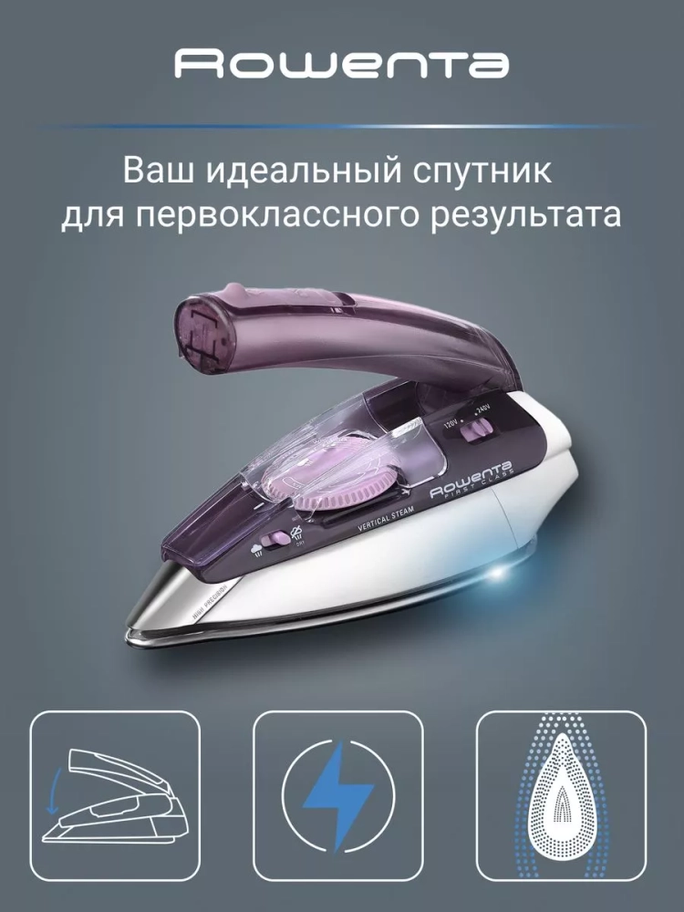 С резервуаром для воды объемом 70 мл и удобной функцией вертикального отпаривания утюг Rowenta First Class станет вашим идеальным спутником в любой поездке. Отличный результат, куда бы вы ни отправились.