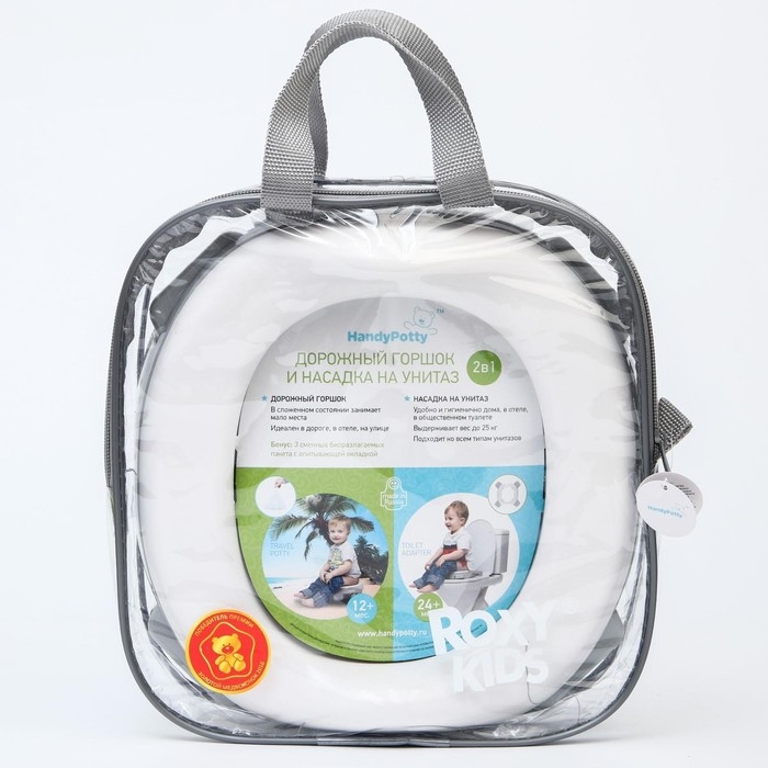 Дорожный горшок для детей HandyPotty обеспечит дополнительный комфорт в путешествии с ребенком. Это простое приспособление сочетает в себе функции обычного горшка, дорожного горшка и адаптера для унитаза. HandyPotty можно использовать дома в классическом положении, в котором ножки приподнимают горшок на комфортную высоту, обеспечивая малышу максимально удобную посадку. В этом режиме необходимо использовать многоразовую вкладку, которая легко вынимается и моется (она продается отдельно). Также горшок можно брать в дорогу со одноразовыми пакетами, которые устанавливаются на место вкладки, а после использования утилизируются как подгузники (3 шт есть в комплекте, при желании вы можете их докупить. Ножки горшка легко складываются, поэтому он не занимает много места. А если зафиксировать ножки в стороны, то HandyPotty может стать надежной портативной накладкой для ребенка на унитазе. В ассортименте ROXY-KIDS есть несколько цветов данных горшков.