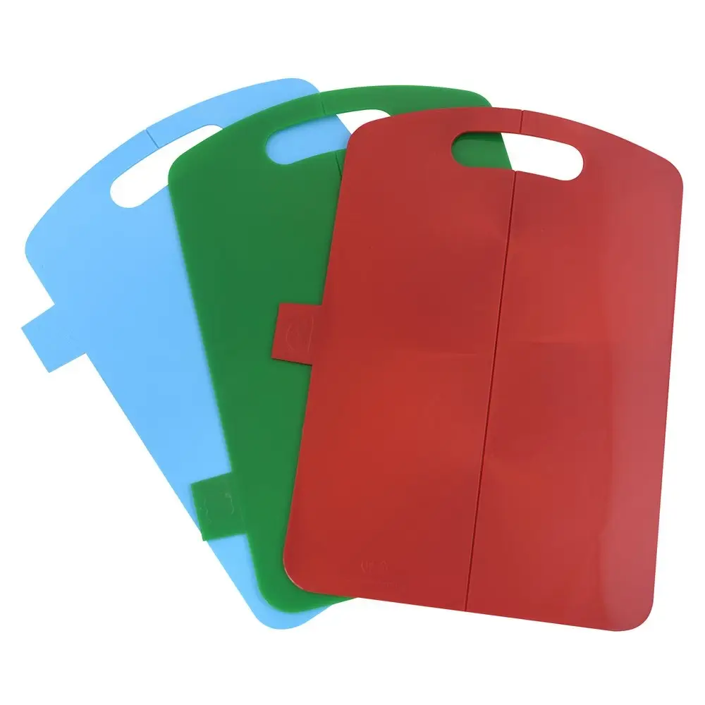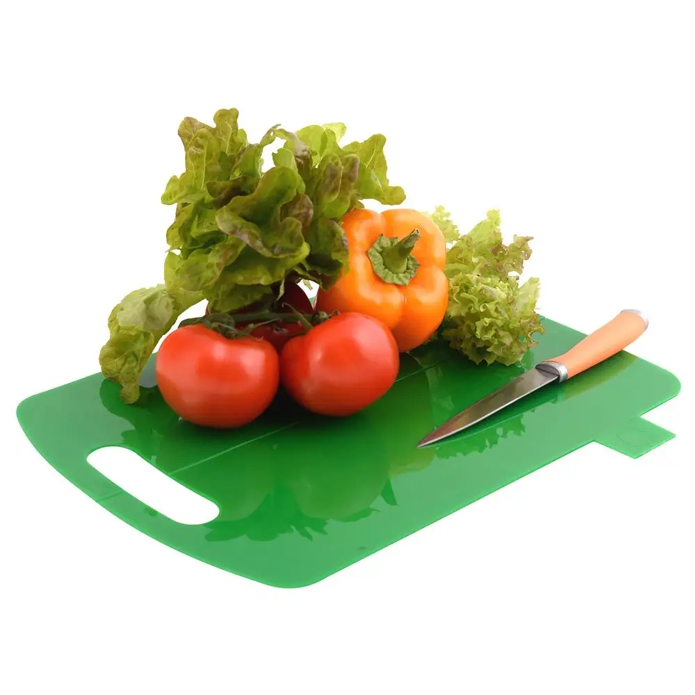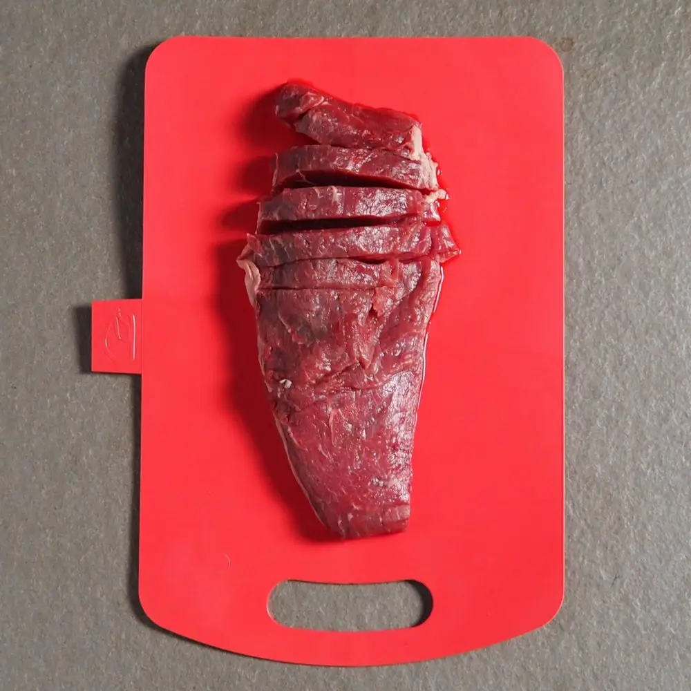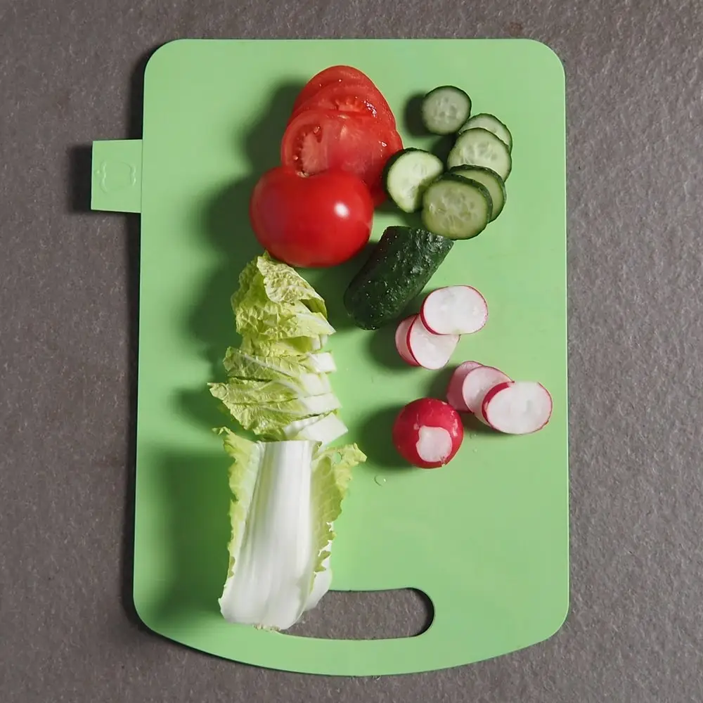 Сгиб по середине доски позволяет согнуть ее и аккуратно ссыпать нарезанные продукты в емкости с салатом, кастрюли и сковородки.
